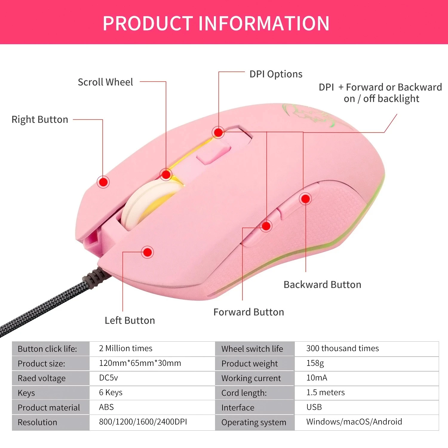 Мышь компьютерная игровая Проводная с розовой подсветкой, 3200DPI