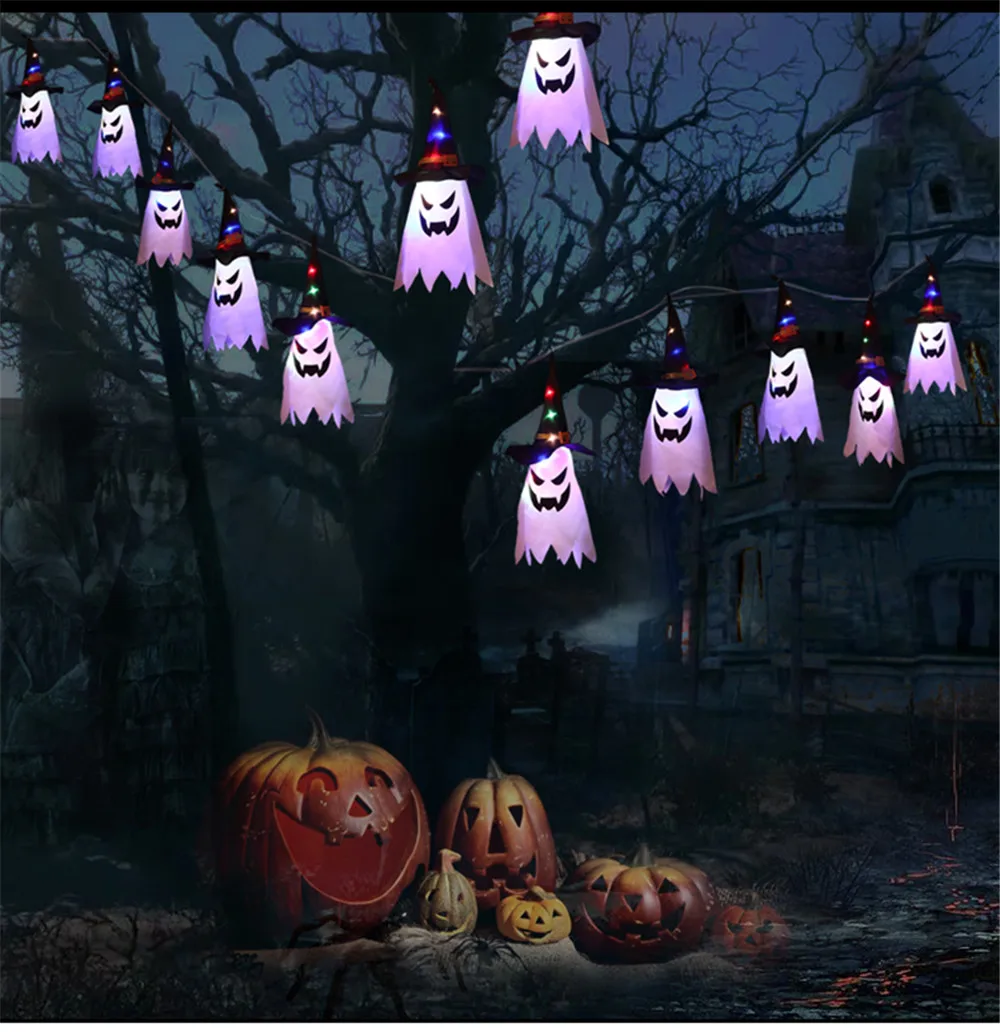 Хэллоуин подвесные украшения светодиодные огни уличный волшебник шляпа лампа привидение лицо Призрак гирлянда атмосфера украшение для дома