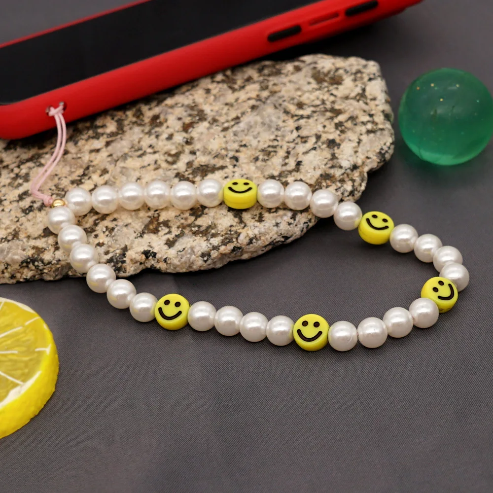 Модный ремешок для мобильного телефона с имитацией жемчуга и смайликом, ремешок для сотового телефона, ремешок с защитой от потери для женщин, летняя бижутерия, аксессуары в подарок