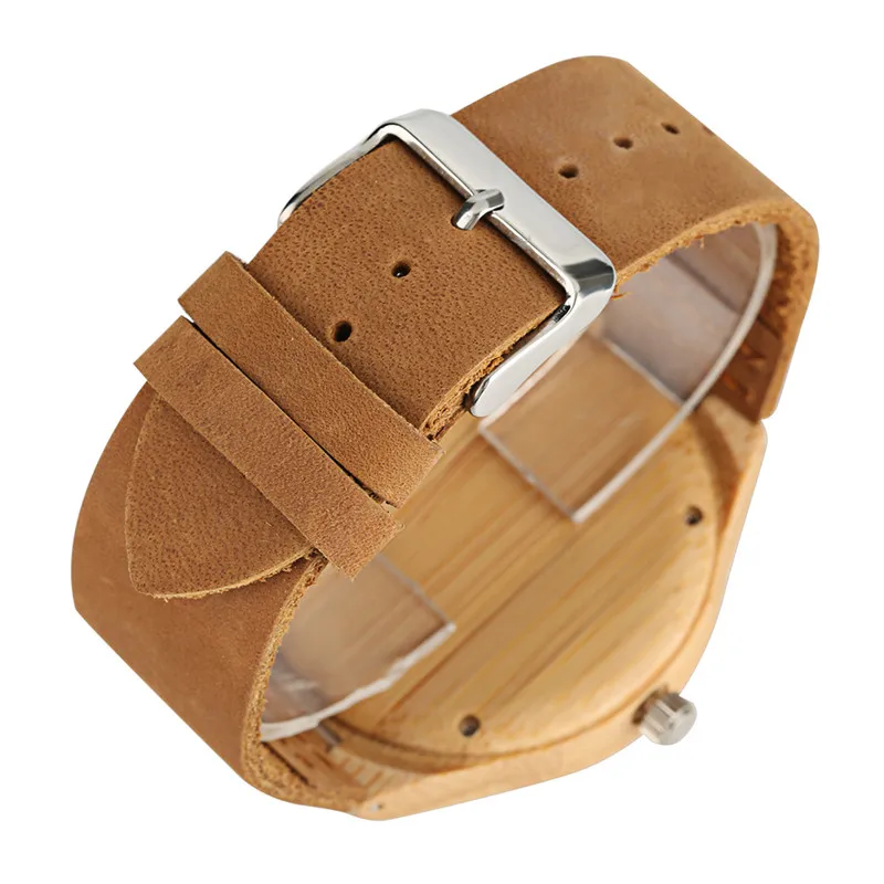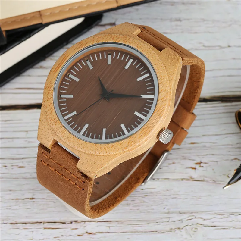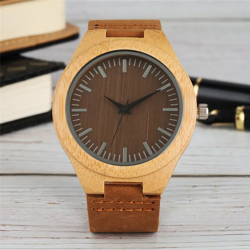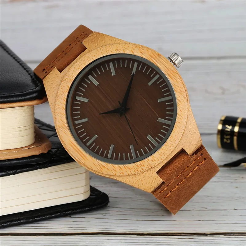 Часы наручные мужские с бамбуковым циферблатом, минималистичные кварцевые с круглым корпусом, аналоговый дисплей, с ремешком из натуральной кожи, подарок