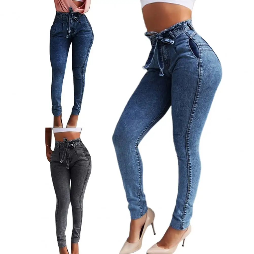 Женские джинсы с множеством карманов, женские джинсы с высокой талией и множеством карманов, облегающие бандажные брюки из денима пуш-ап с кисточками для повседневного ношения, 2021