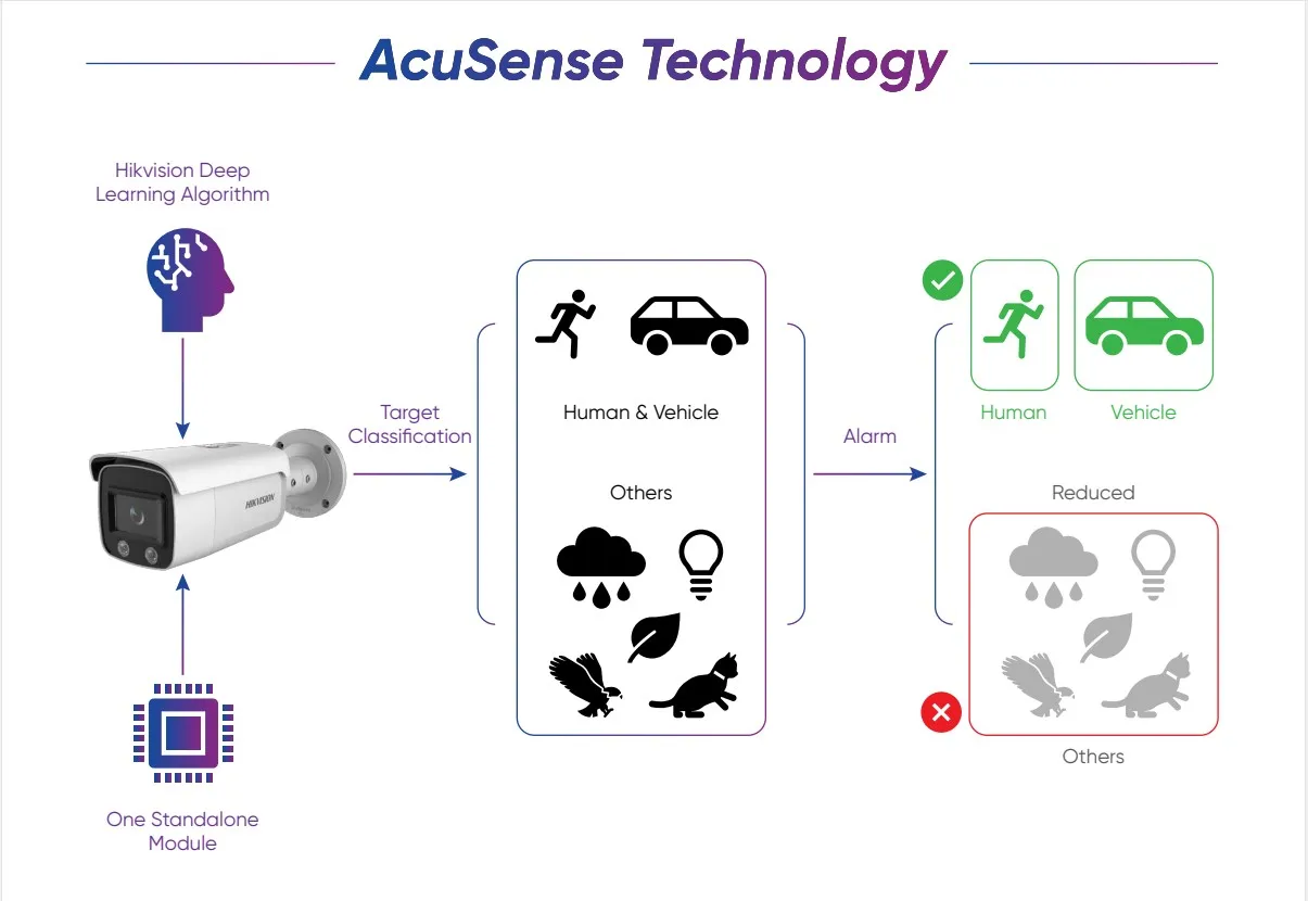 Технология Hikvision AcuSense, основанная на алгоритмах глубокого обучения, обеспечивает классификацию мишеней людей и транспортных средств на передних и задних устройствах. Система фокусируется на целях человека и транспортного средства, значительно повышает эффективность и эффективность сигнализации.