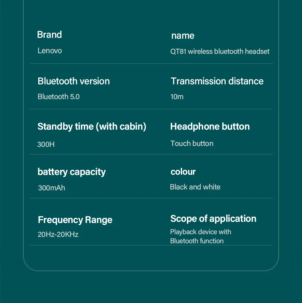 Версия Bluetooth: V5.0Название сопряжения Bluetooth: Lenovo XT91Емкость аккумулятора: 300 мАчАккумулятор для наушников: 40 мАчВремя игры: 4 часаВремя работы в режиме ожидания: около 100 часовДиаметр динамика: 8 ммЧувствительность: 115 (IEC711 при 1 кГц)Расстояние: около 10 метров