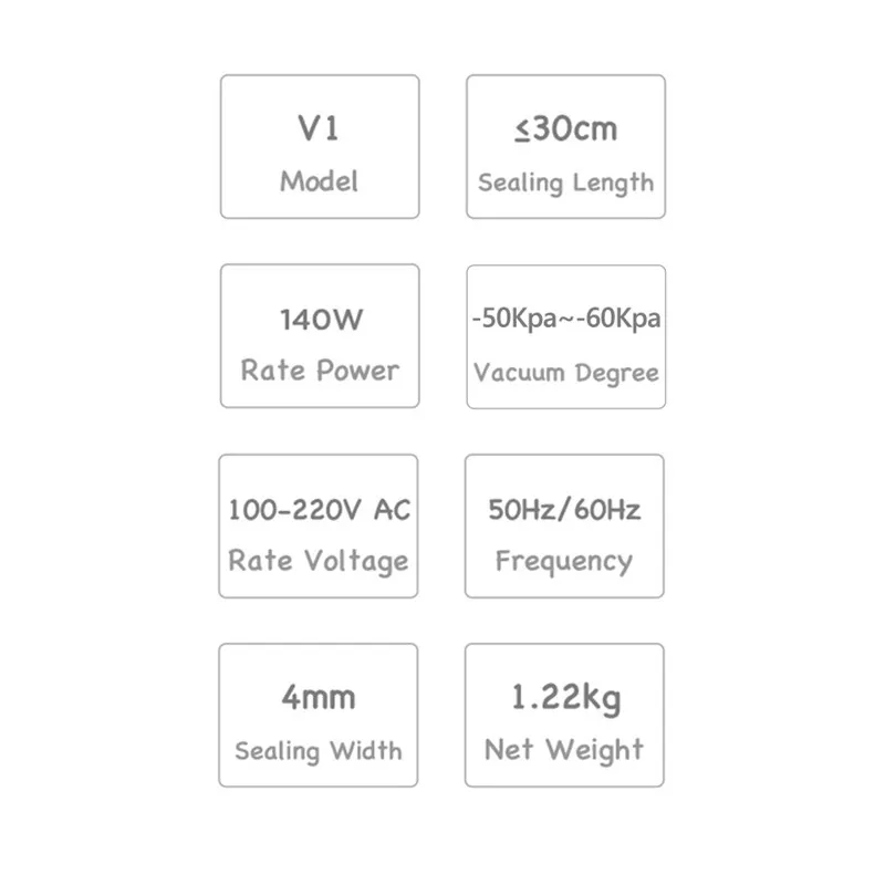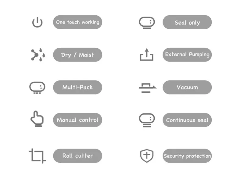 Функция: извлечение и запечатывание воздуха, раздельное запечатывание, извлечение внешнего воздуха, выбор сухого и влажного, с резцом