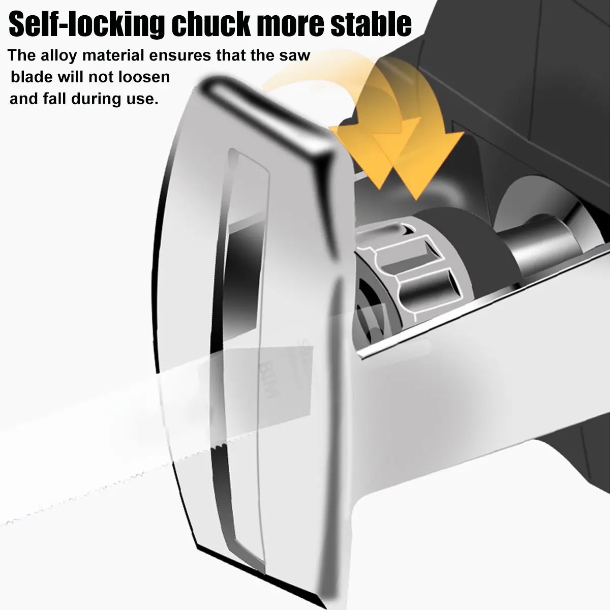 ● Высокая мощность.● Электрический тормоз.● Переменная скорость.● Изменение лезвия без инструмента.● Эргономичная ручка.● Триггер с рычагом блокировки.● Новый Разработанный кривошипный механизм для более высокой эффективности.