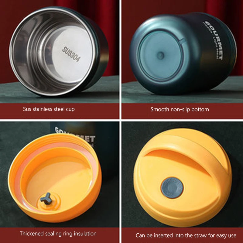 1. Он может быть заполнен водой, чтобы сохранить тепло.2. Герметичный и герметичный, теплоизоляция и обжигание.3. Дыхательный клапан может быть вставлен в соломинку и может использоваться в качестве чашки для воды.4. Отдельный дизайн, его можно использовать в качестве двух чашек.5. Подходит для приготовления молока, кофе, питьевой воды, питательного супа и т. д.6. Крюк и ручка, легко взять.