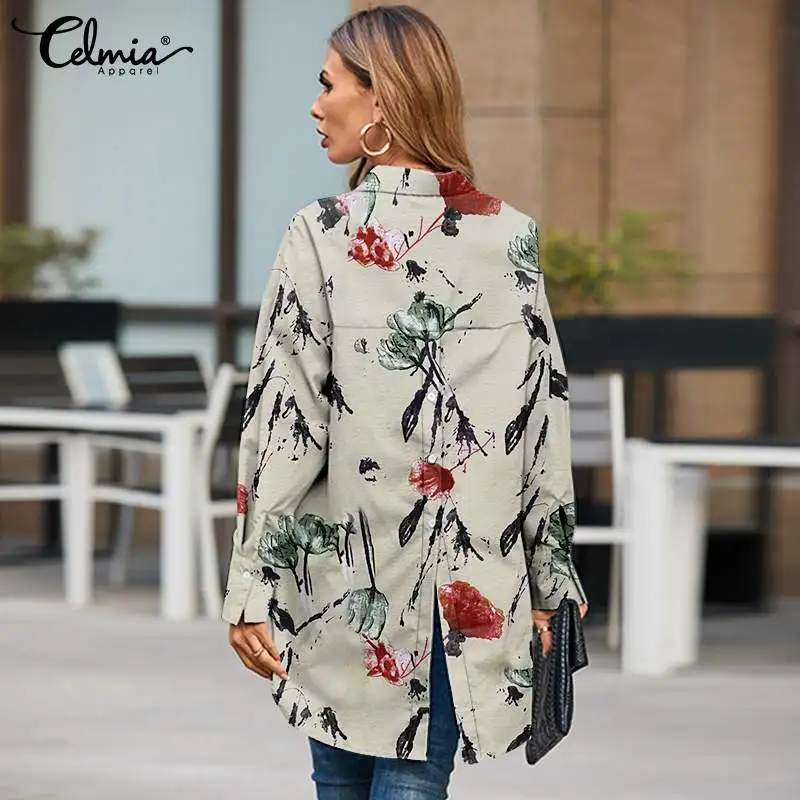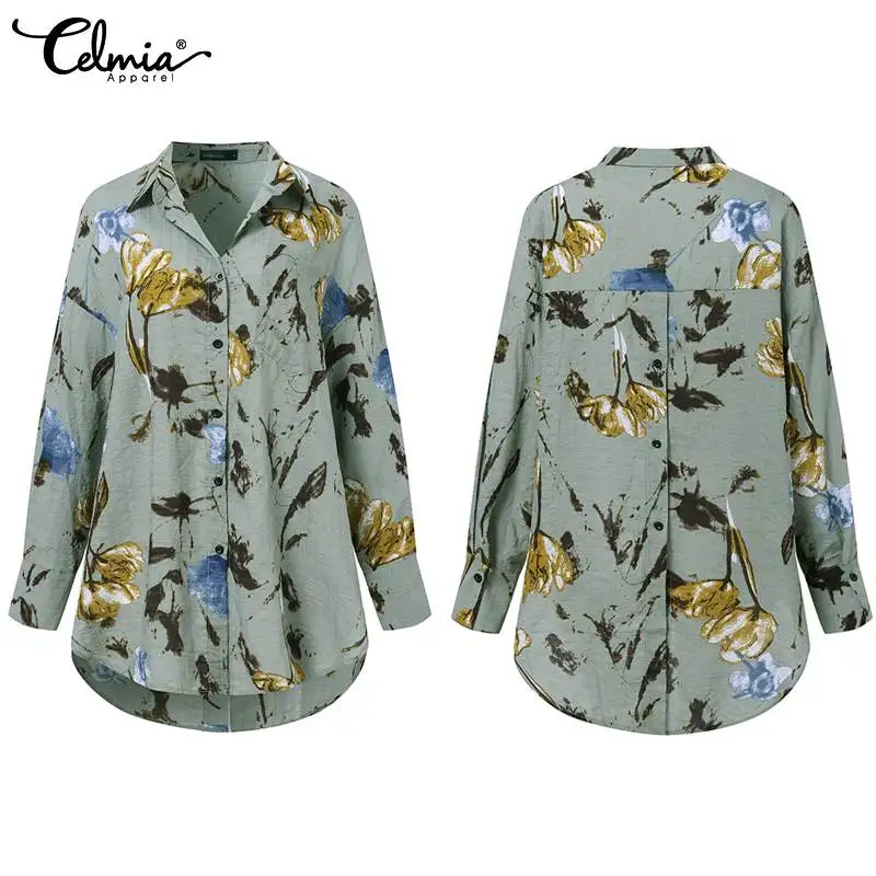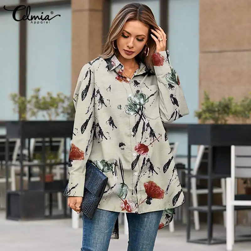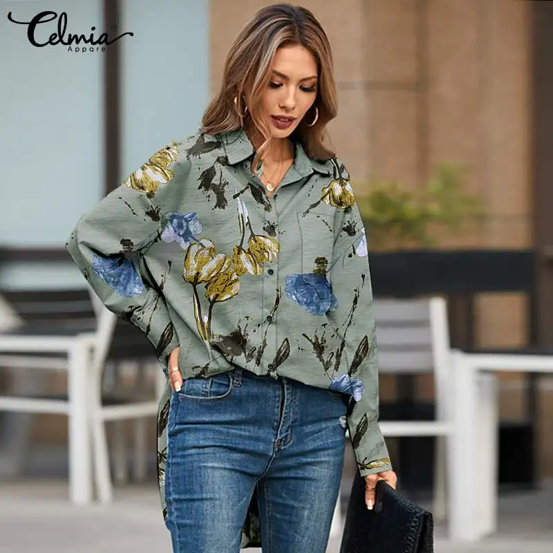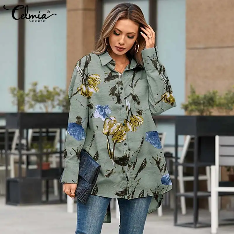 Винтажные рубашки с цветочным принтом для женщин Celmia осень 2021 блузка с длинным рукавом ассиметричные повседневные свободные Топы Большие размеры длинные блузы