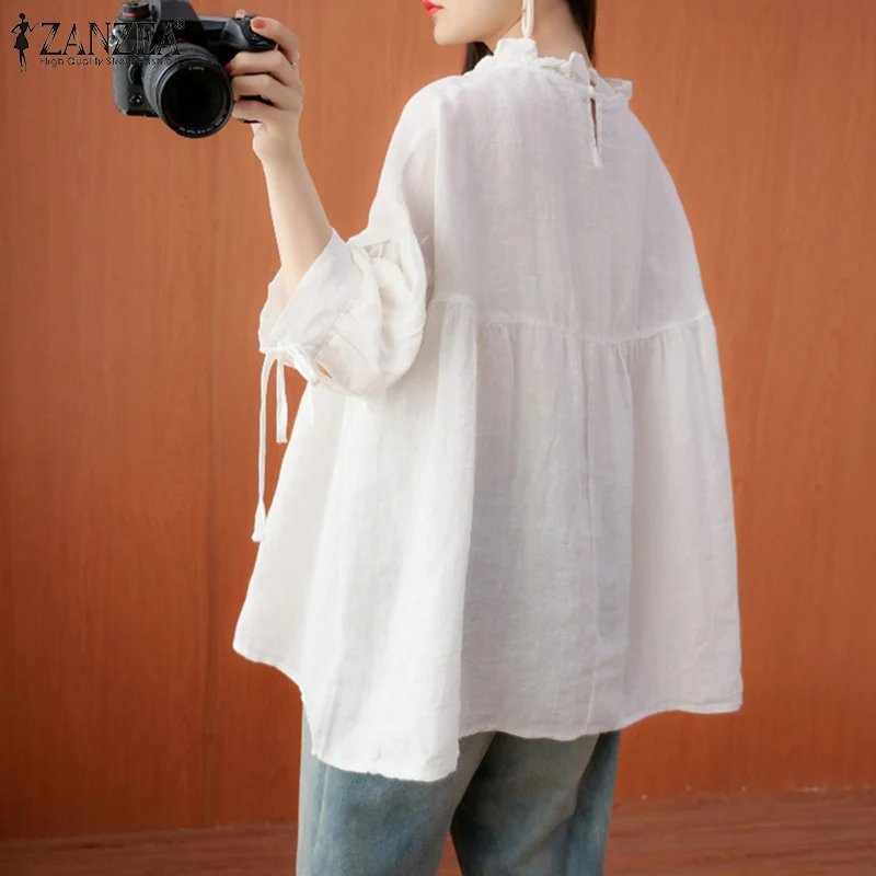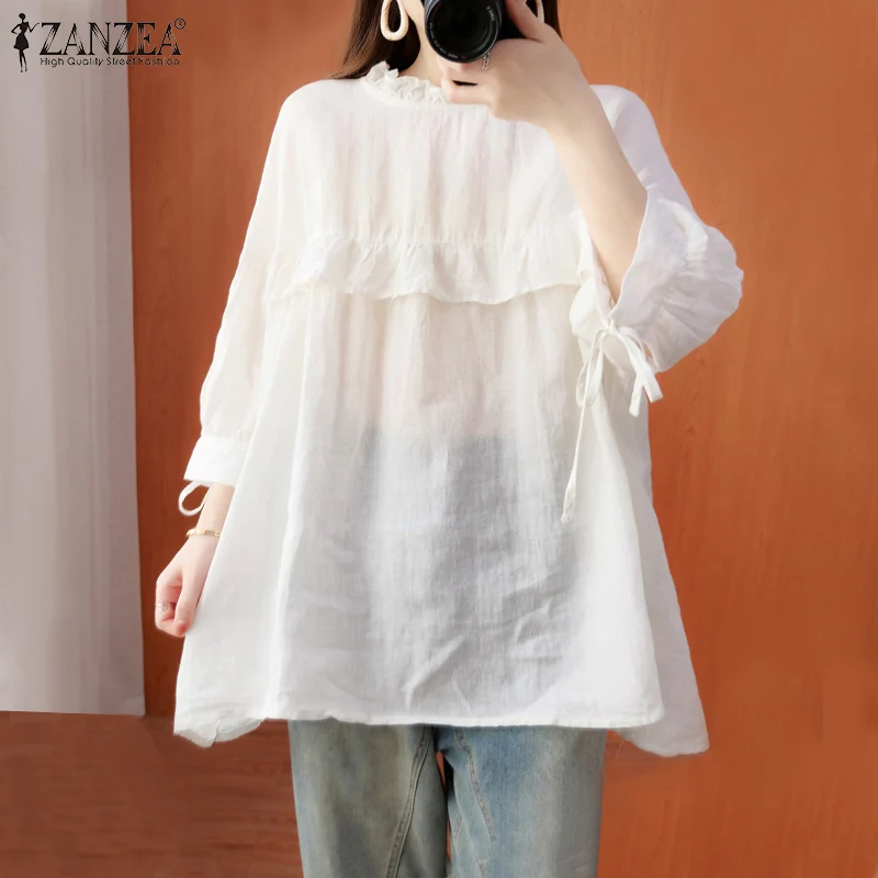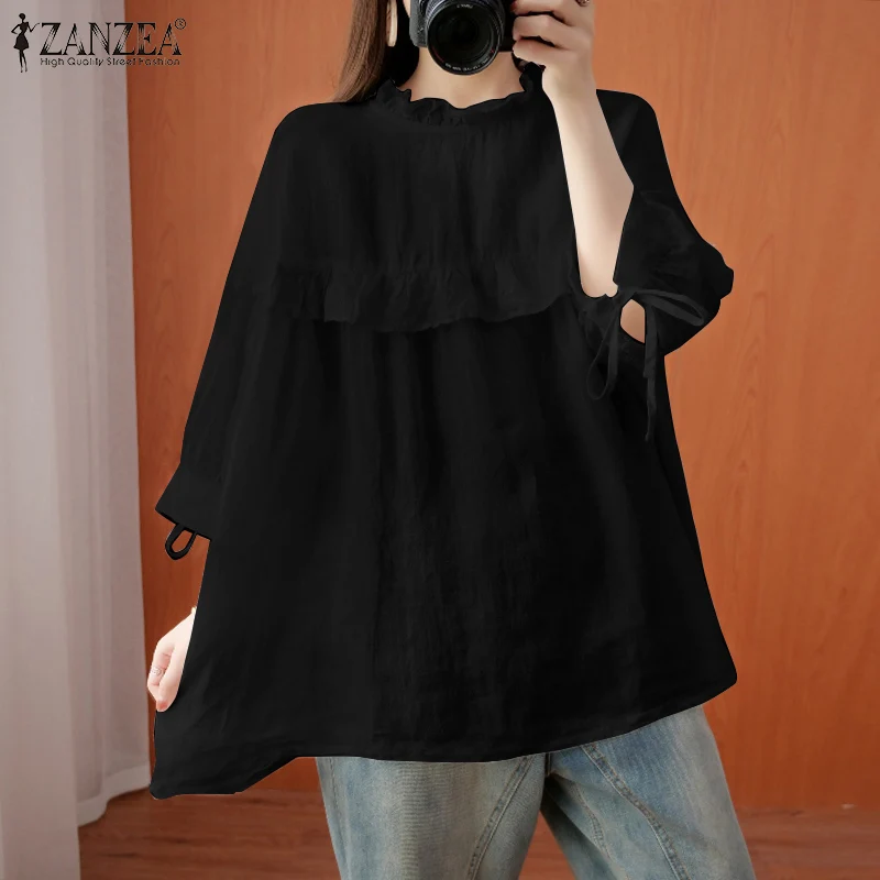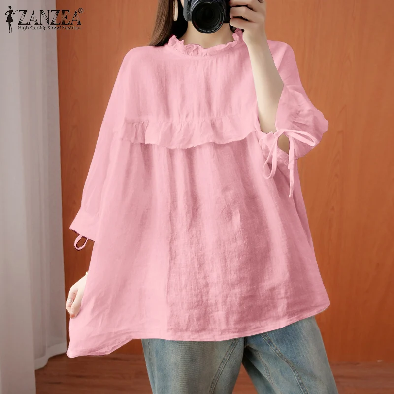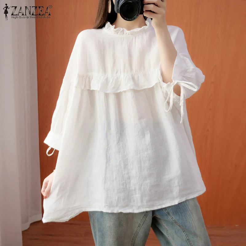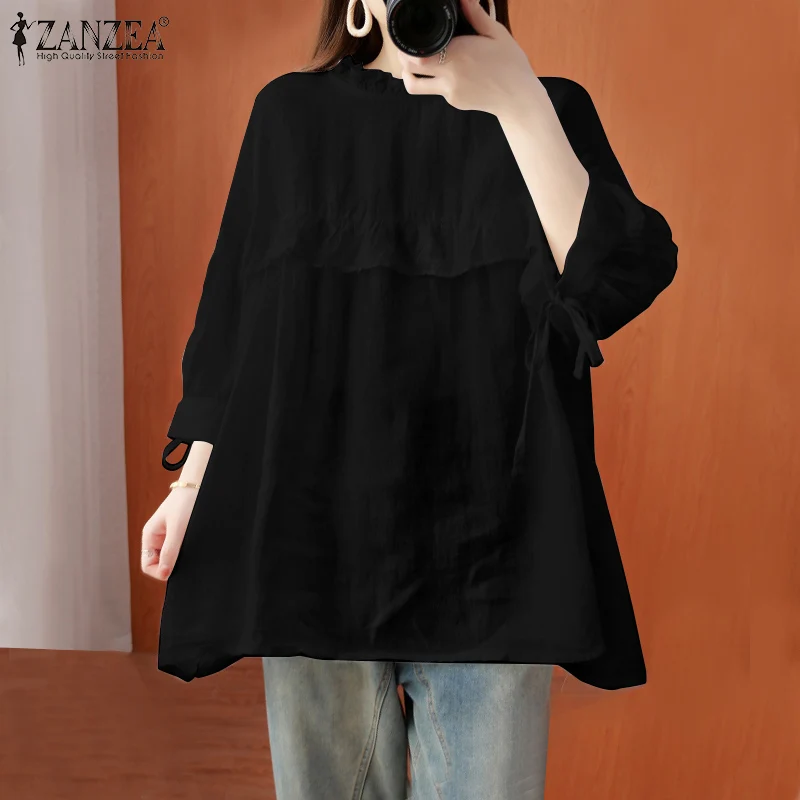 Модные осенние однотонные топы ZANZEA 2022, женские блузки с оборками, блузы с рукавом 34, Женская туника в стиле пэчворк, Повседневная рубашка, Топ 7