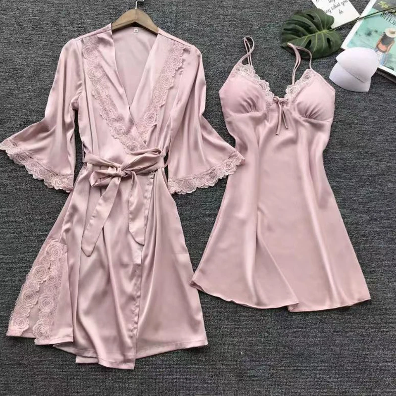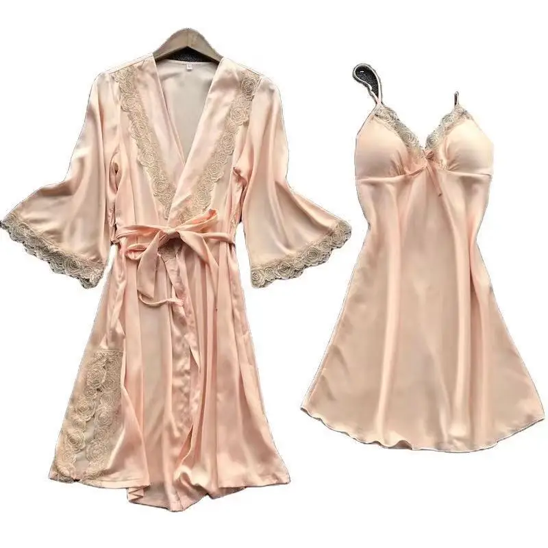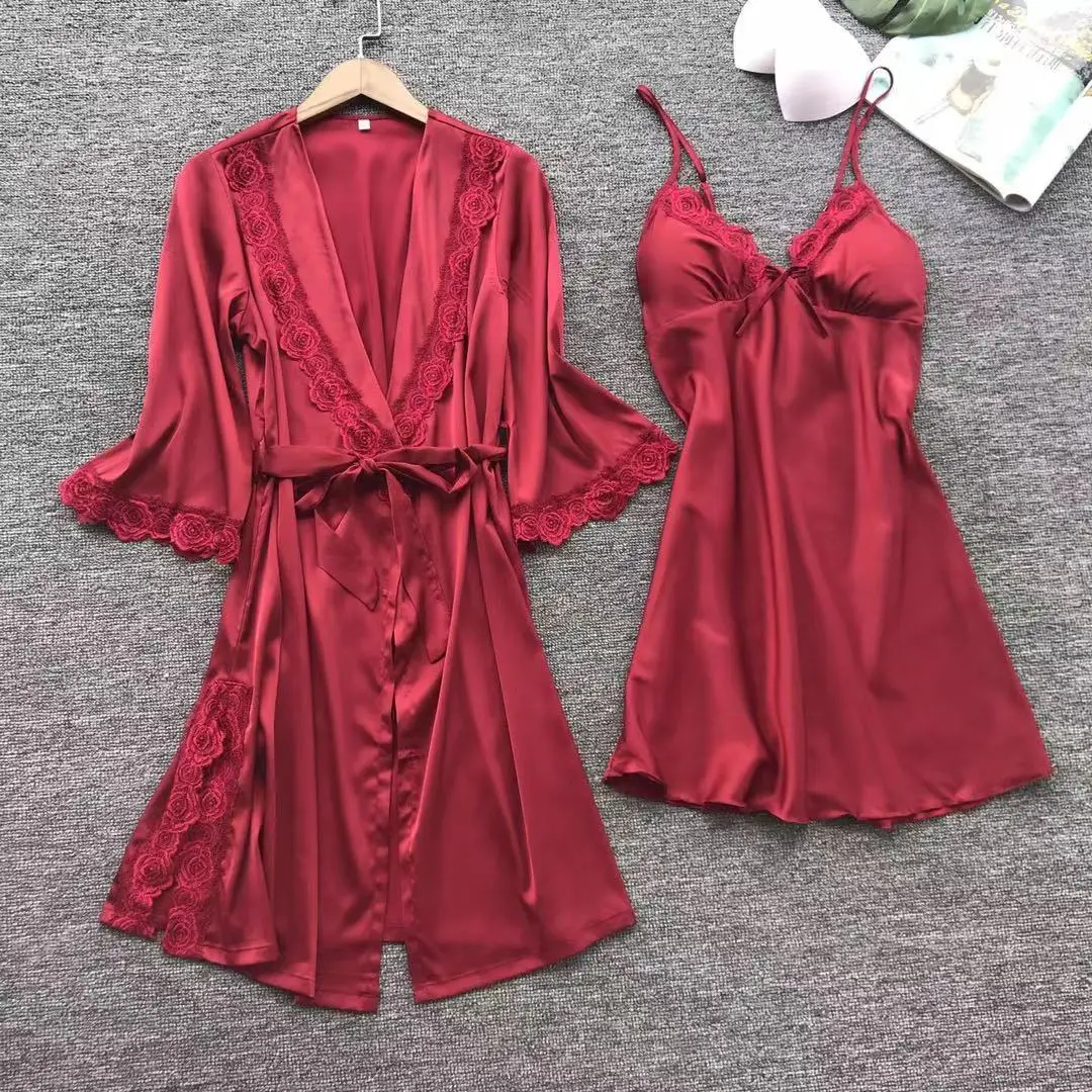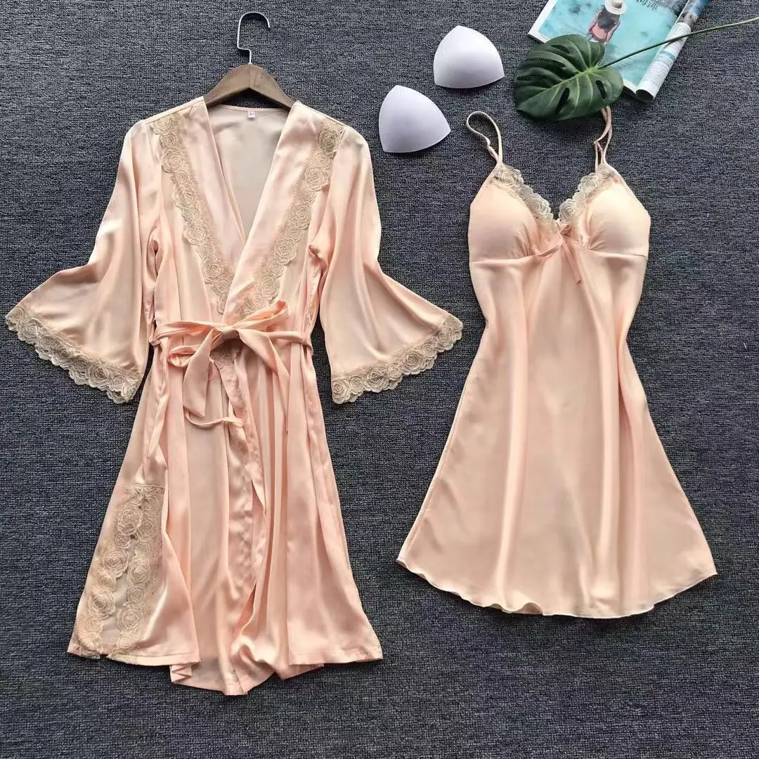Женский шелковый халат, комплект одежды, летний Пижамный кружевной ...