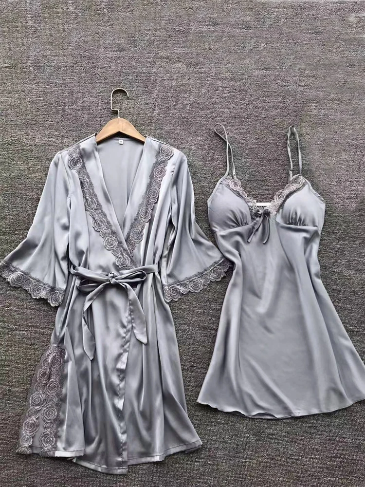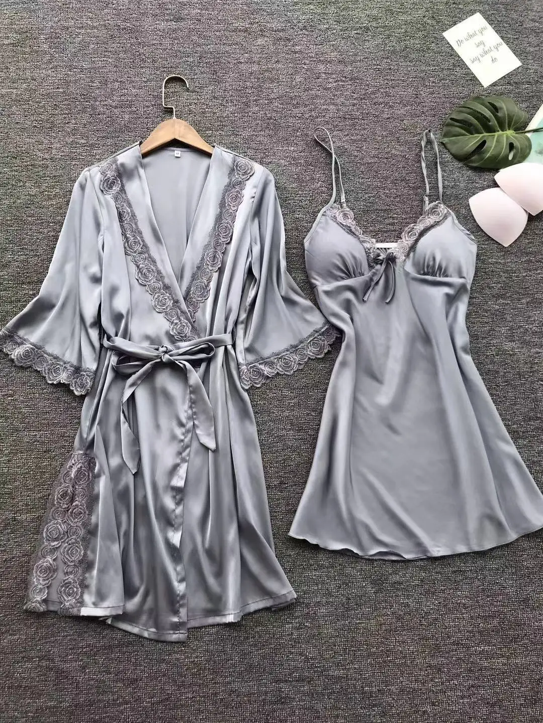 Для женщин кружева сатиновая мягкая Пижама Халат пижамный комплект ...