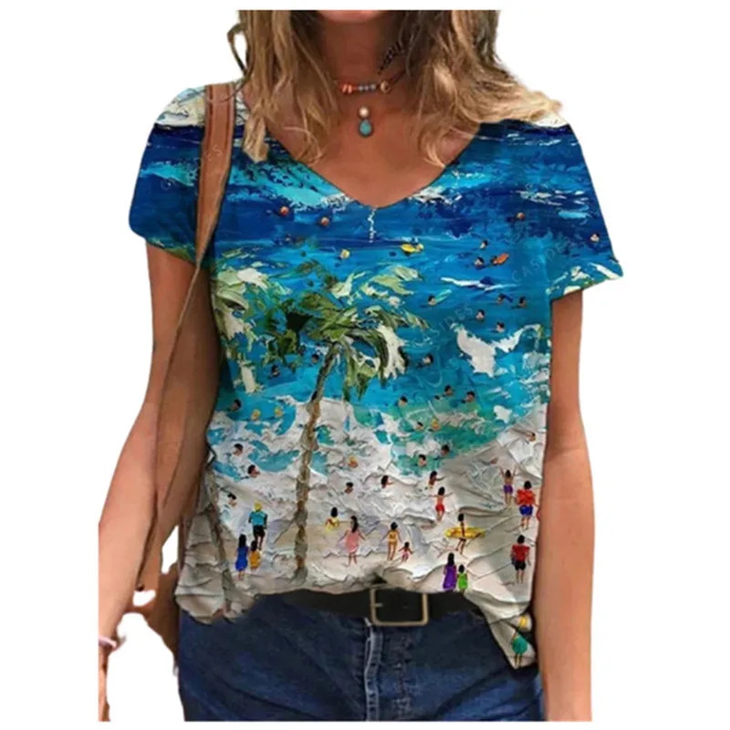 Женская футболка с коротким рукавом, V-образным вырезом и принтом