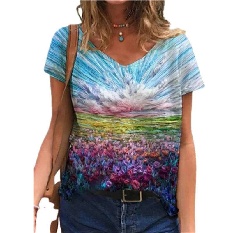 Женская футболка с коротким рукавом, V-образным вырезом и цветочным...