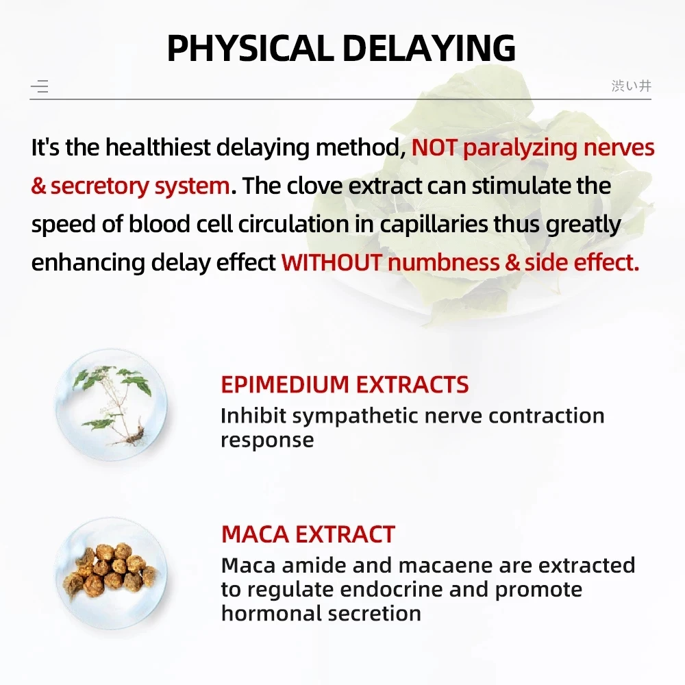 Это самый здоровый метод задержки, который не парализует нервы и секреторную систему. Экстракт Гвоздики может стимулировать скорость кровообращения клеток в капиллярах, тем самым значительно усиливая эффект задержки без онемения и побочных эффектов.