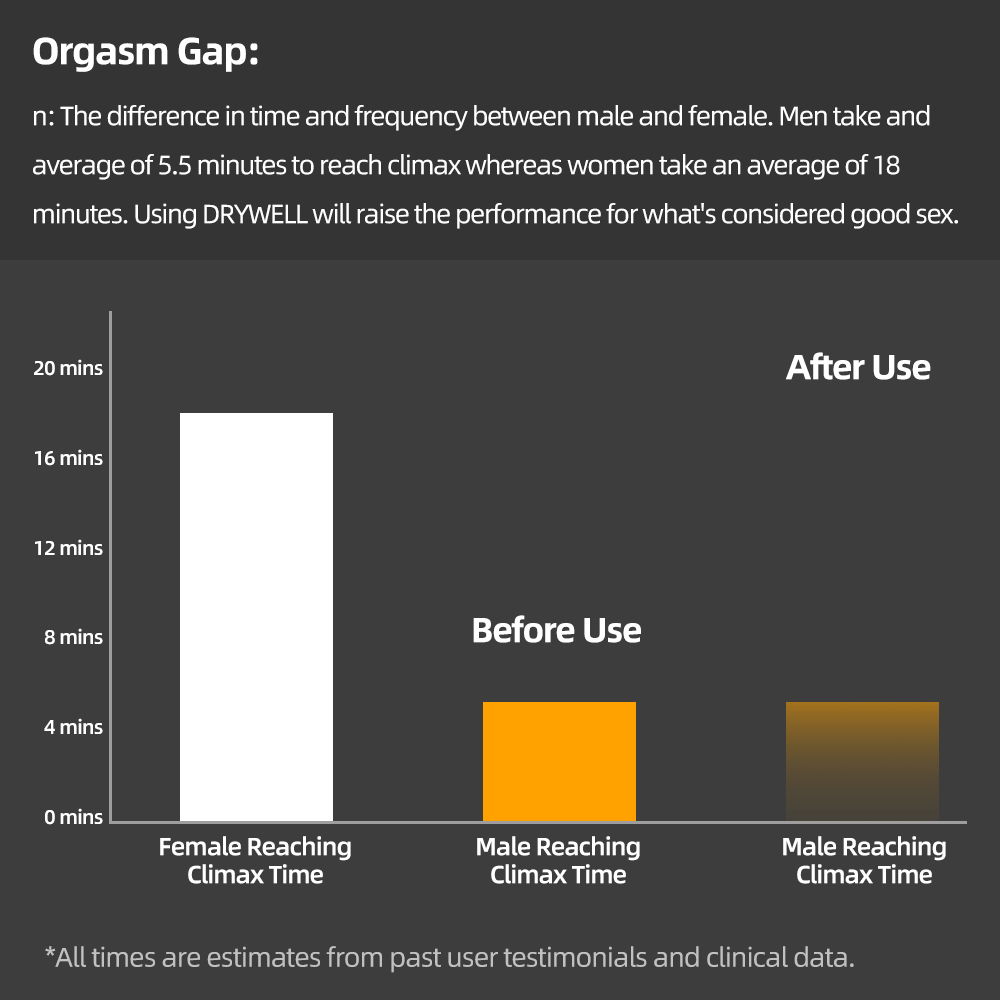N: разница во времени и частоте между мужчинами и женщинами. Мужчинам требуется в среднем 5,5 минут, чтобы достичь кульминации, в то время как мужчинам требуется в среднем 18 минут. Использование DRYWELL повысит производительность для того, что считается хорошим сексом.
