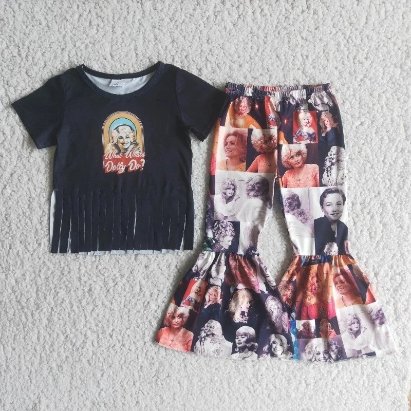 Оптовая продажа, детская эксклюзивная одежда для маленьких девочек, черные наборы музыкальной певицы с кисточками и короткими рукавами, Детские леопардовые брюки, модная одежда