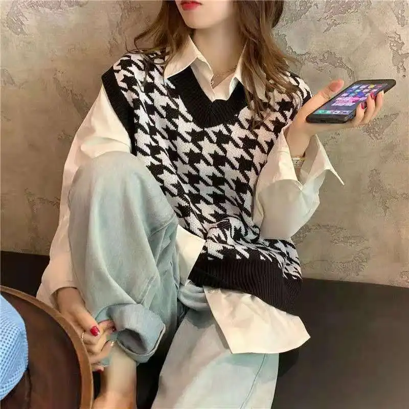Свитер, весна-осень 2021, женский жилет, модный свитер в Корейском стиле, жилет в стиле преппи для девушек с V-образным вырезом, женская футболка