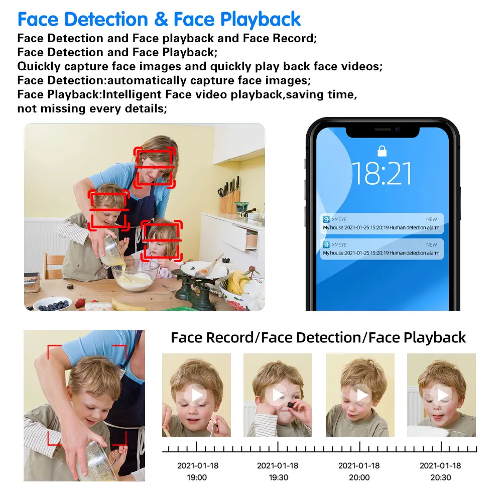 Распознавание лица, воспроизведение лица и запись лица; Быстрое снятие изображений лица и быстрое воспроизведение видео лица; Распознавание лица: автоматическое снятие изображений лица;Воспроизведение лица: интеллектуальное воспроизведение видео, экономия времени, не пропустите все детали;