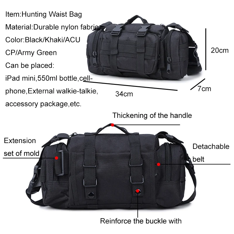 Товар: охотничья поясная сумка/нагрудная сумкаМатериал: прочная нейлоновая тканьРазмер: 34*7*20 см (Д * Ш * В)Емкость: ниже 15 лЦвет: черный/хаки/ACU/CP/армейский зеленыйМожно разместить: iPad mini, Бутылка 550 мл, мобильный телефон, внешняя рация, пакет аксессуаров и т. д.