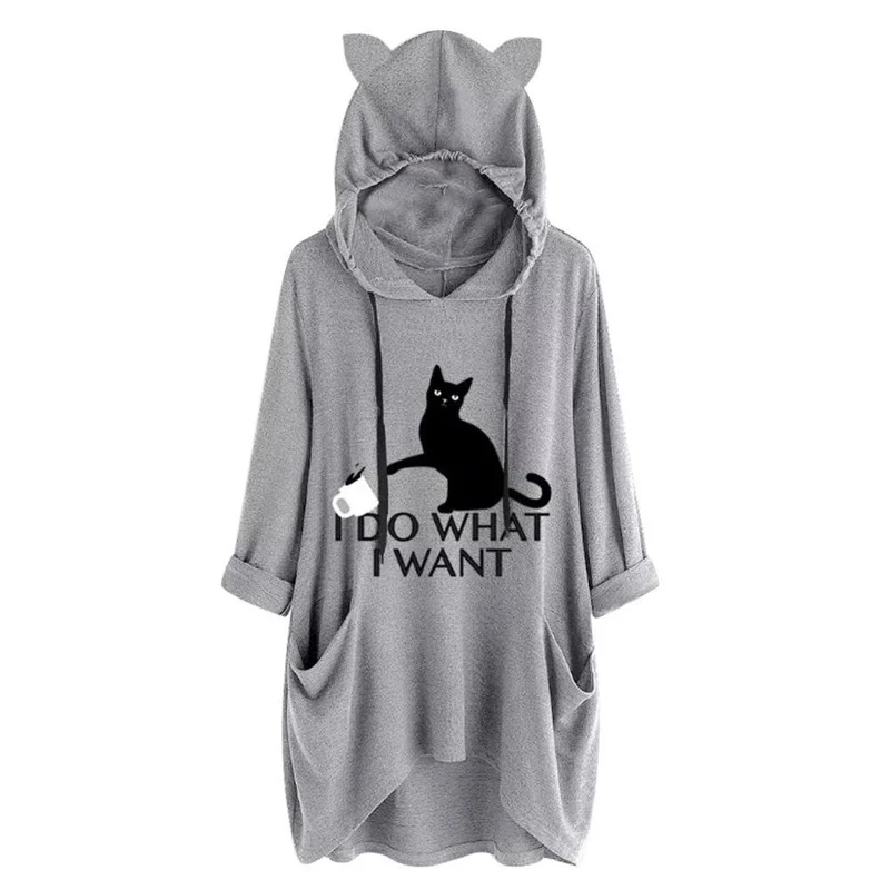 Футболка женская с принтом кошачьих ушей и капюшоном, Модная стильная ассиметричная футболка с длинными рукавами и карманами, с графическим принтом