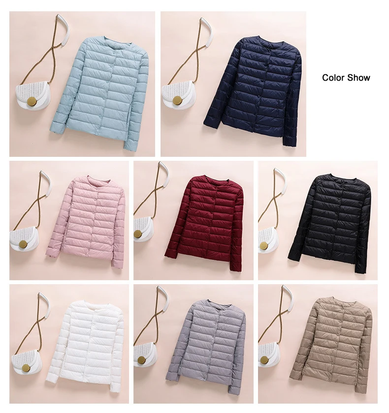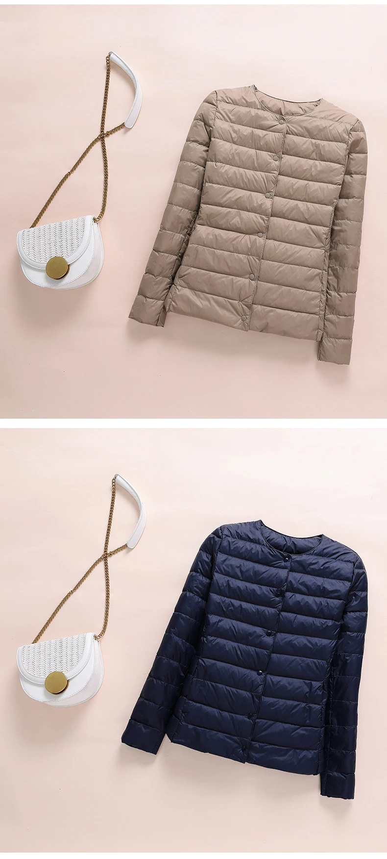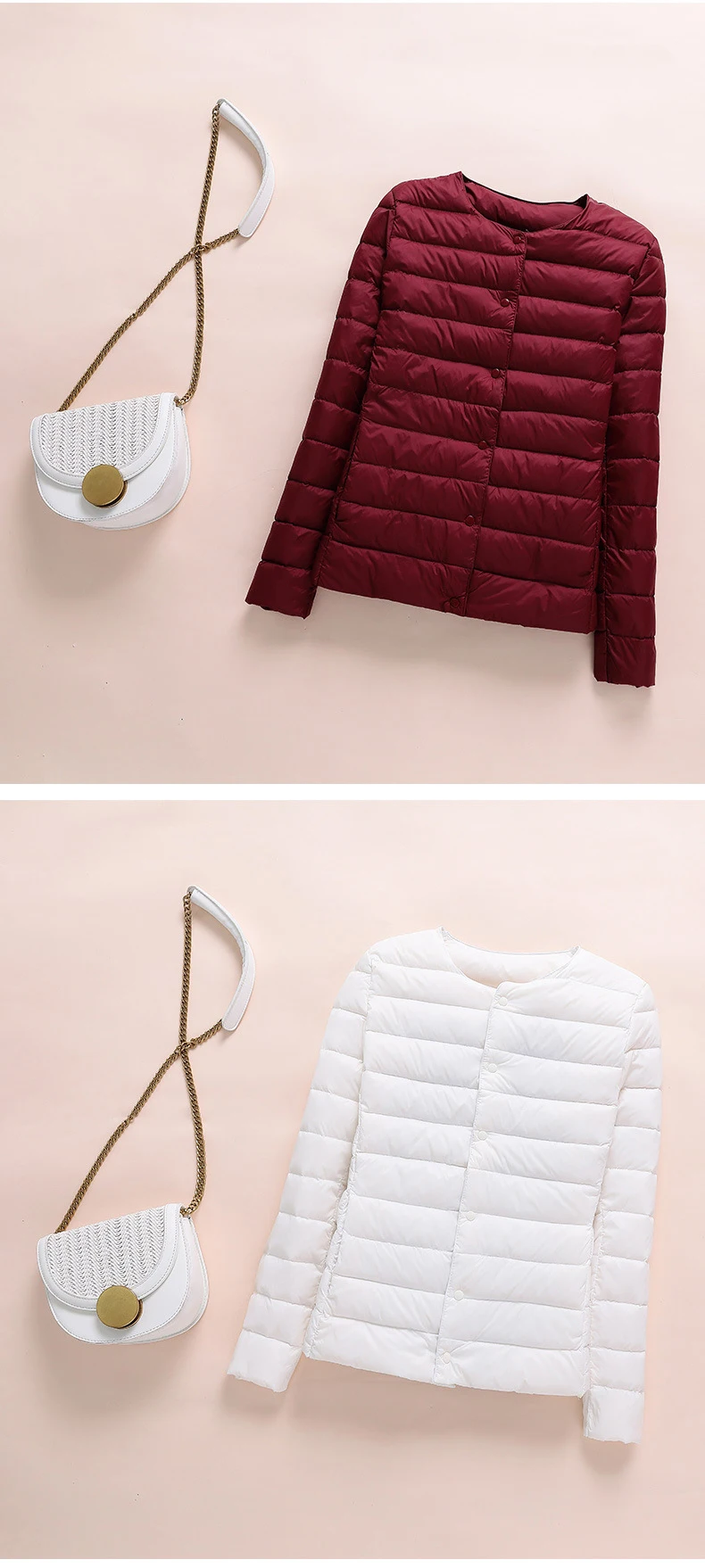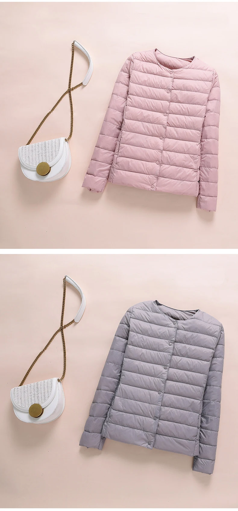 Новинка 2021, зимнее женское пуховое пальто, сверхлегкая куртка на утином пуху без воротника, портативные женские парки с подкладкой, пуховое пальто с круглым вырезом