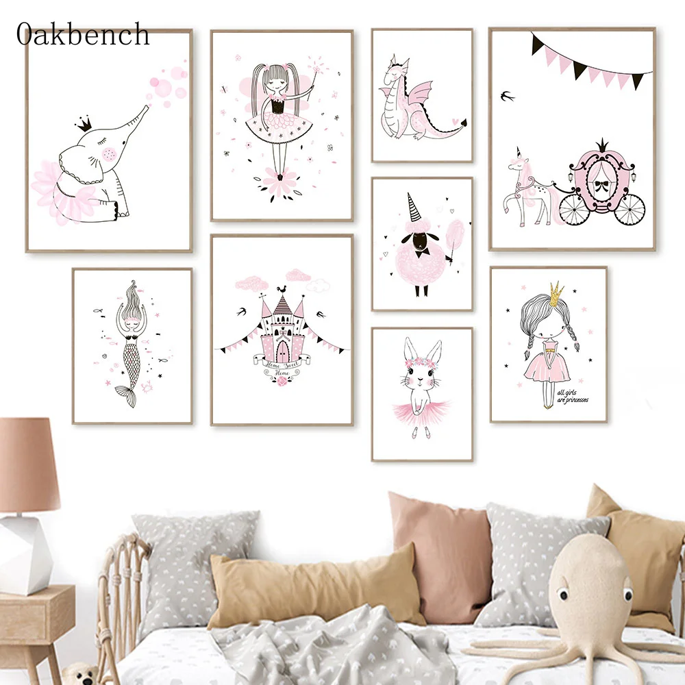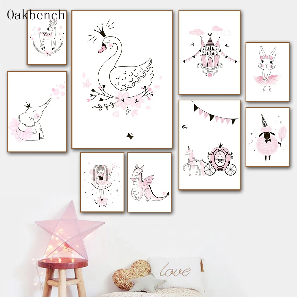 Детская Настенная картина, розовая Картина на холсте, девушка, искусственный лебедь, слон, плакаты с оленем, скандинавские настенные картины, украшение детской комнаты