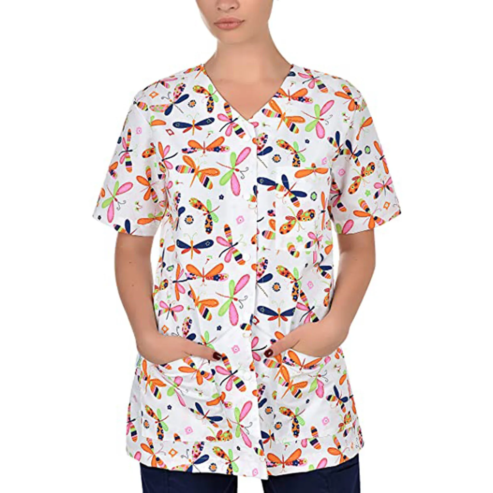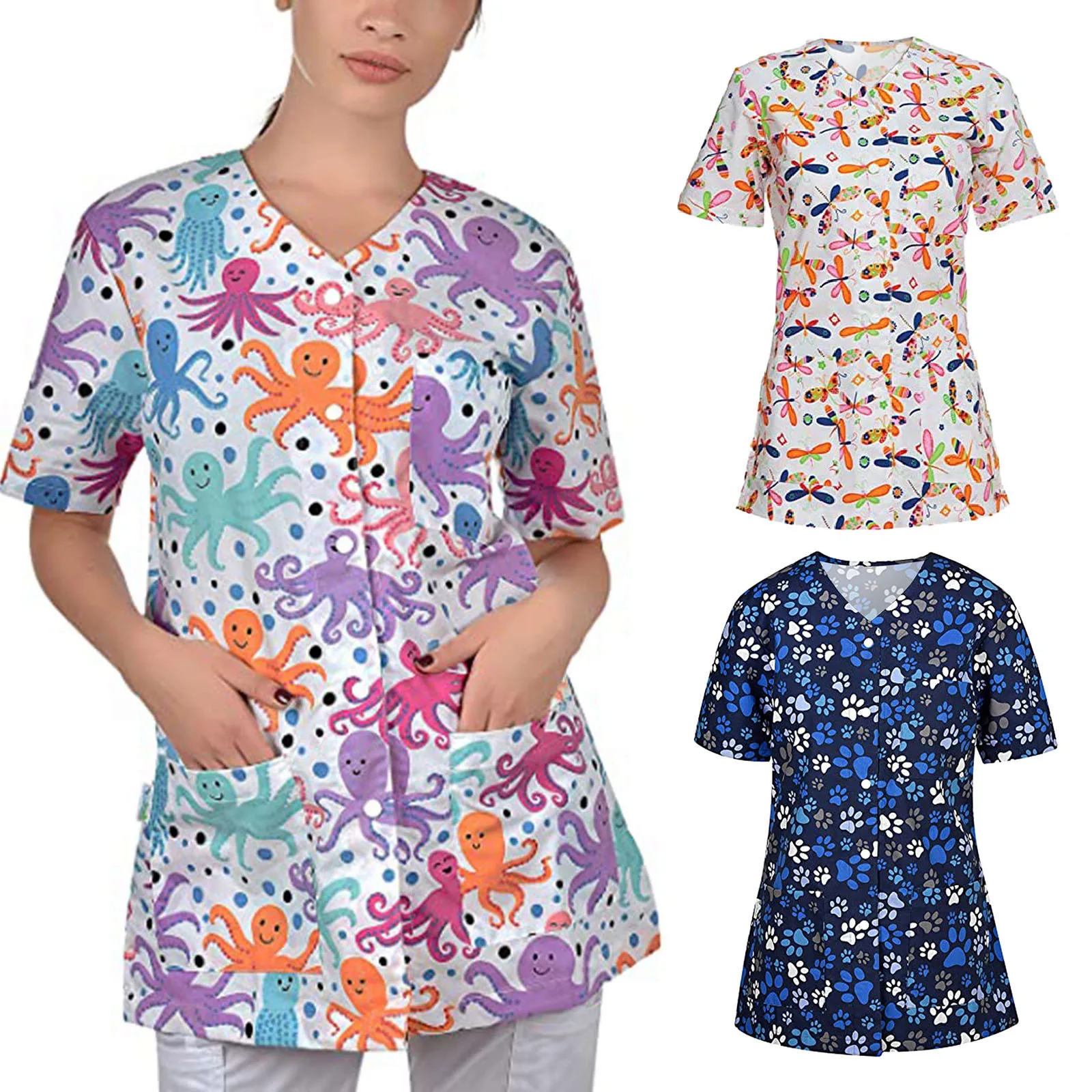 Униформа медсестры, женская одежда с коротким рукавом и V-образным вырезом, топы, скрабы, Женская рабочая блузка, Топ клинической формы с мультяшным принтом