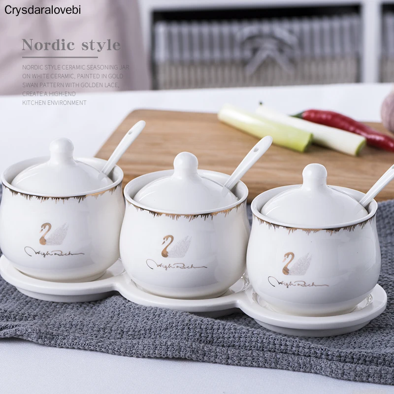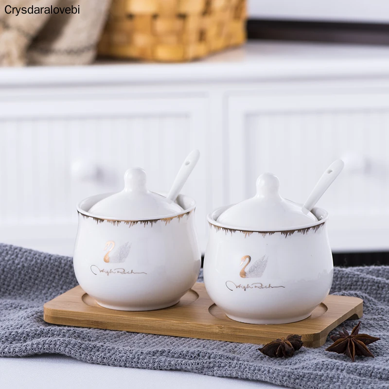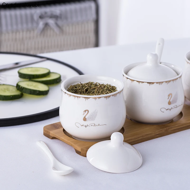 Керамический набор банок для приправ, коробка для специй, набор кухонных принадлежностей, бутылка для приправ, солевой горшок, трехсекционный керамический поднос, бамбуковый деревянный поднос