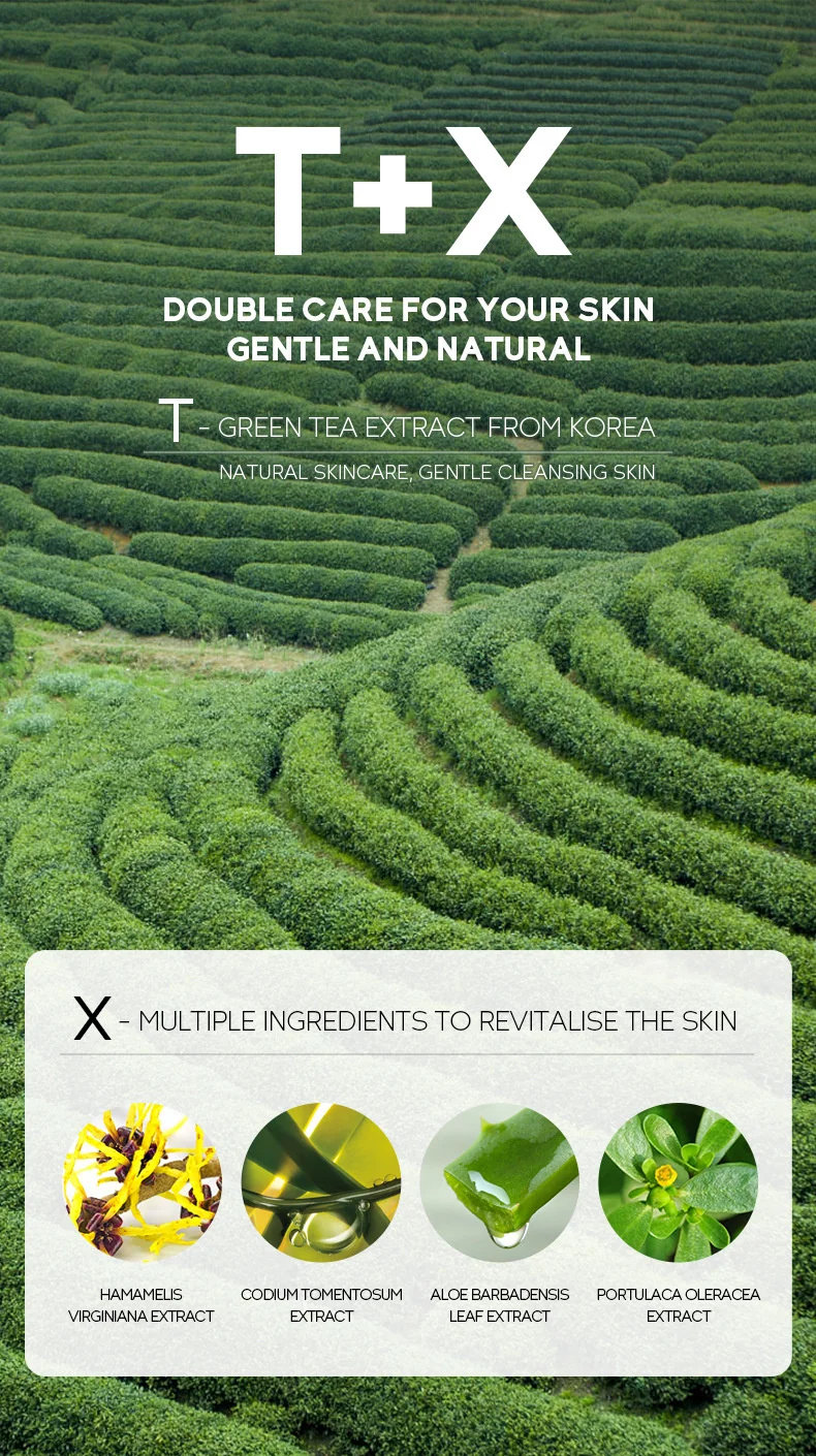 Специально подобранная формула «T + X», экстракт чая, в сочетании с Североамериканским орешником ведьмы и мягкими водорослями для волос, освежающий и увлажняющий, Балансирующий секрецию масла и успокаивающий сухой кожи.
