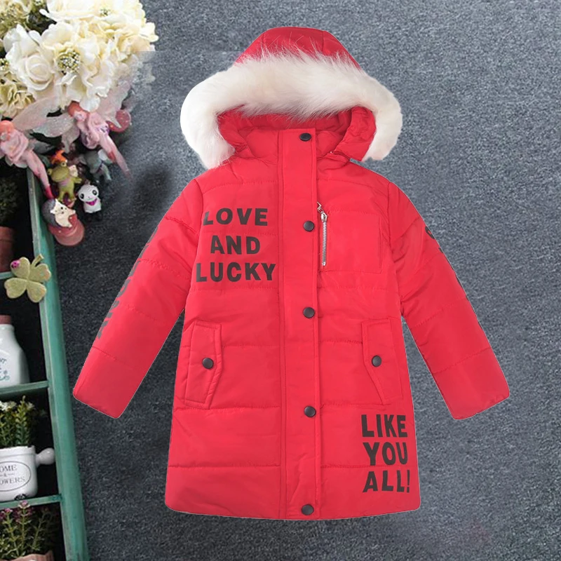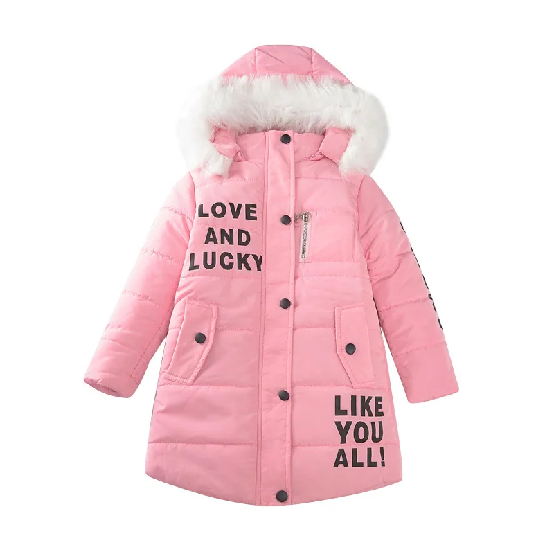 Зимняя пуховая стеганая куртка для девочек, плотная теплая куртка средней длины с надписью, модная стеганая куртка для девочек с меховым воротником, куртка с капюшоном