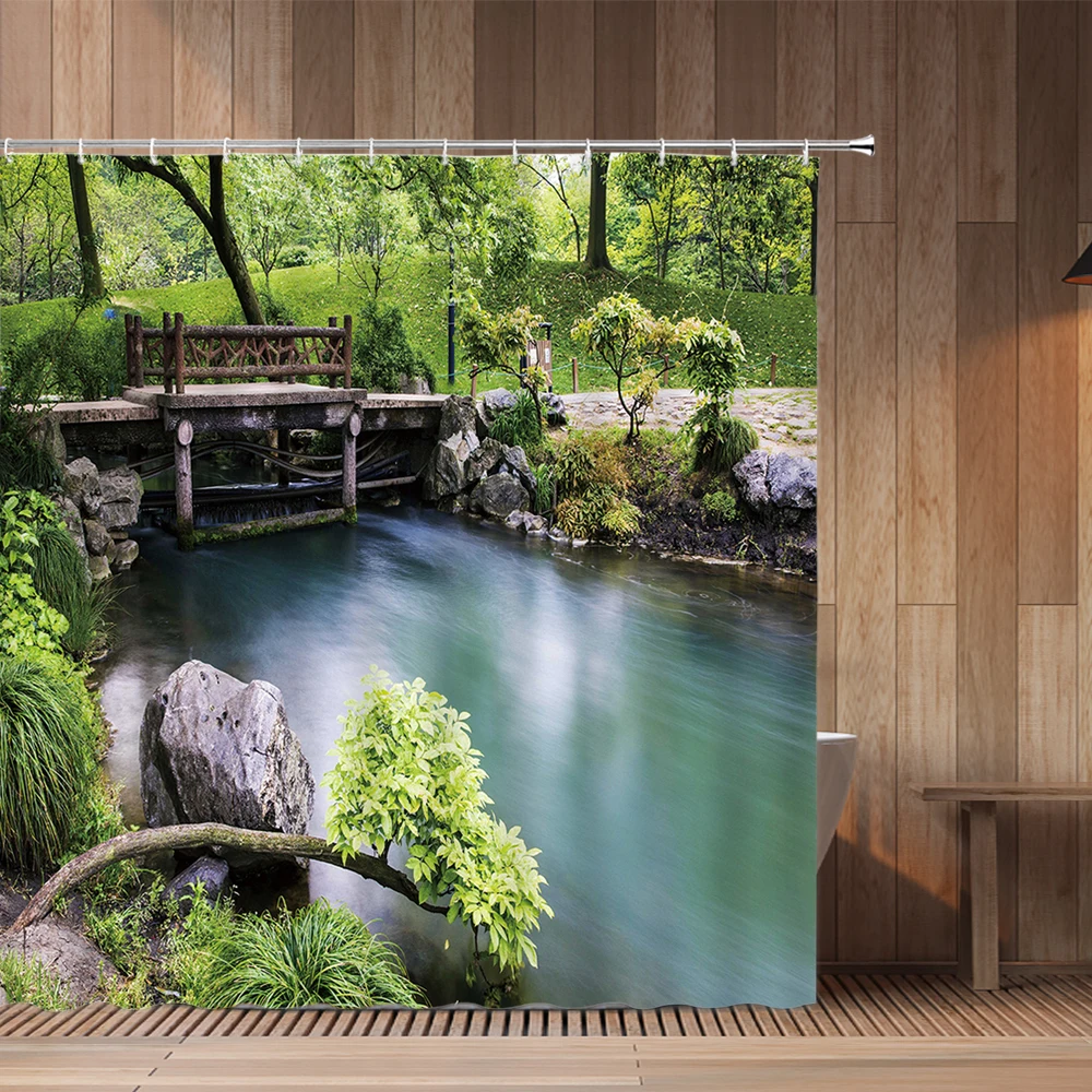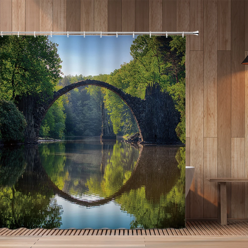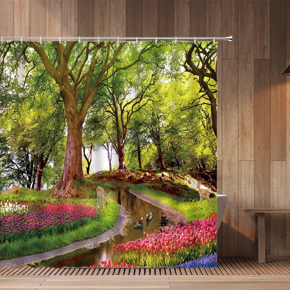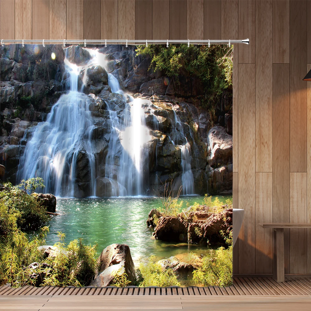Занавеска для душа с изображением леса, водопада, пейзажа