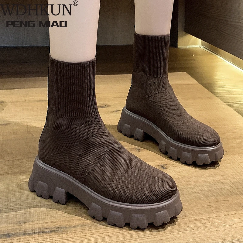 Женские вязаные ботинки, повседневные ботинки на толстой подошве, сетчатые красные короткие сапоги, большие размеры, Осень-зима 2021