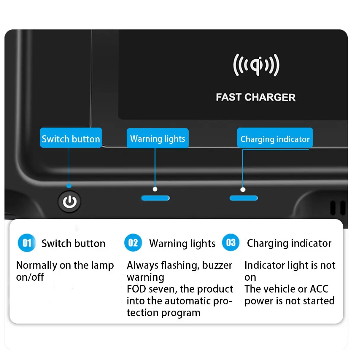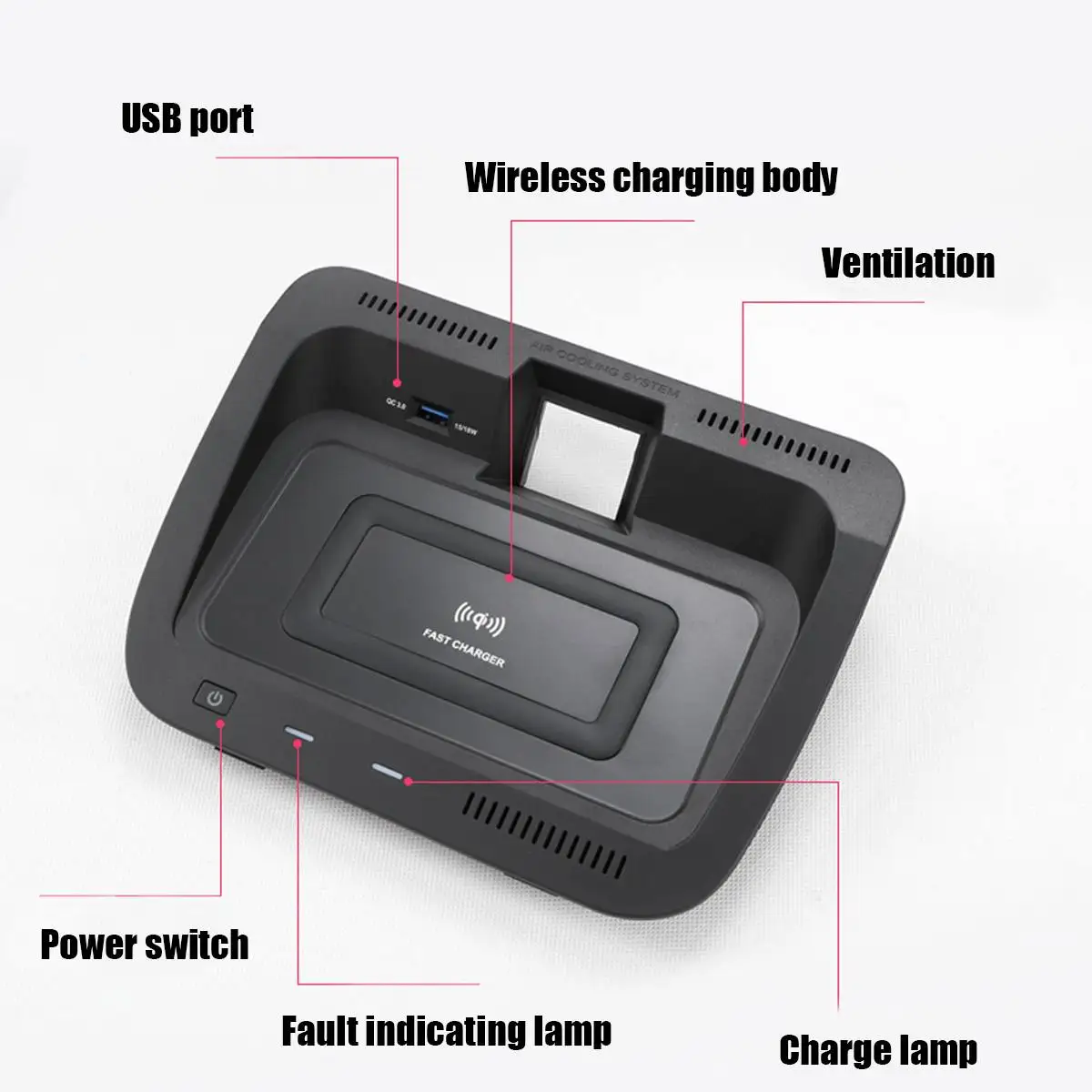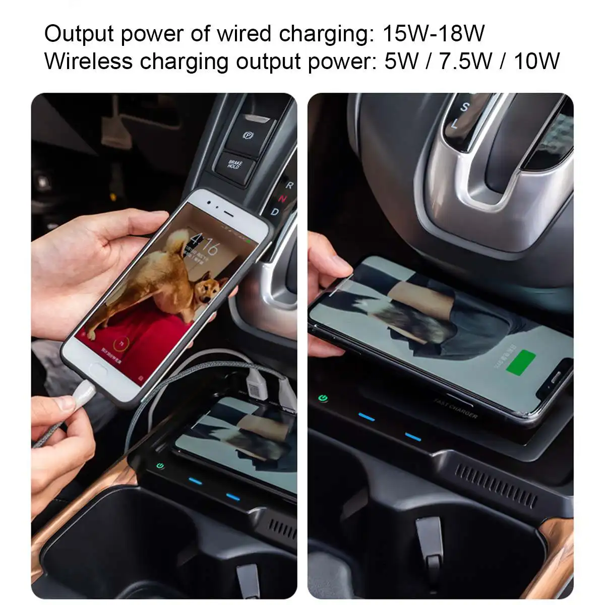 Особенности:-Интерфейс USB, может поддерживать зарядку 15 Вт/18 Вт, выходную мощность 10 Вт/15 Вт, максимальный коэффициент конверсии 85%.-Встроенный бесшумный турбо-вентилятор, конструкция контроля температуры рассеивания тепла, мобильный телефон не нагревается.-Беспроводная зарядка Qi и Быстрая зарядка через интерфейс QC3.0/USB, одновременная Прямая зарядка двумя устройствами.-Интеллектуальный чип AI, интегрированный протокол быстрого воздействия.-Защита от перегрузки по току, перенапряжения, контроля температуры, короткого замыкания и других многозарядных устройств, чтобы защитить мобильный телефон от аккумулятора.-Оригинальный Автомобильный режим, идеальная интеграция оригинального салона автомобиля, без проводки, непосредственно вставляется прикуриватель.Посылка включает в себя:1x Беспроводное зарядное устройство