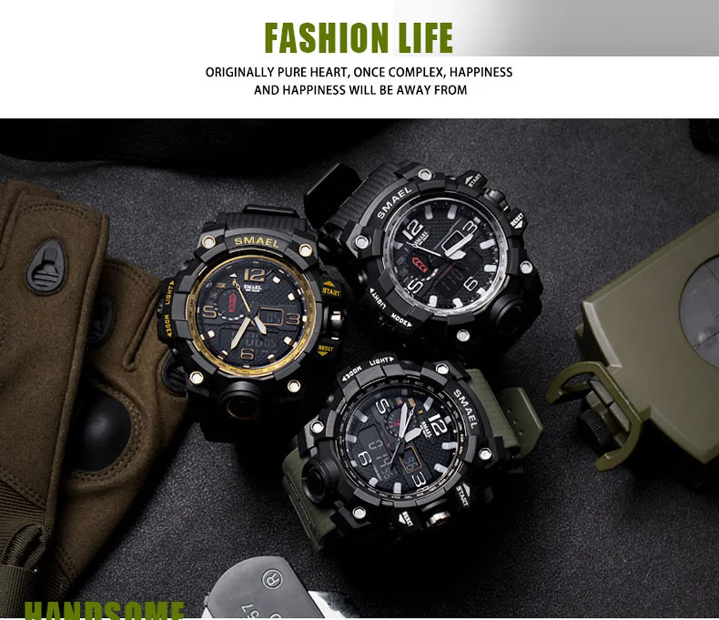 Мужские Аналоговые электронные часы SMAEL, со светодиодной подсветкой, в стиле милитари, с двойным дисплеем, в подарок