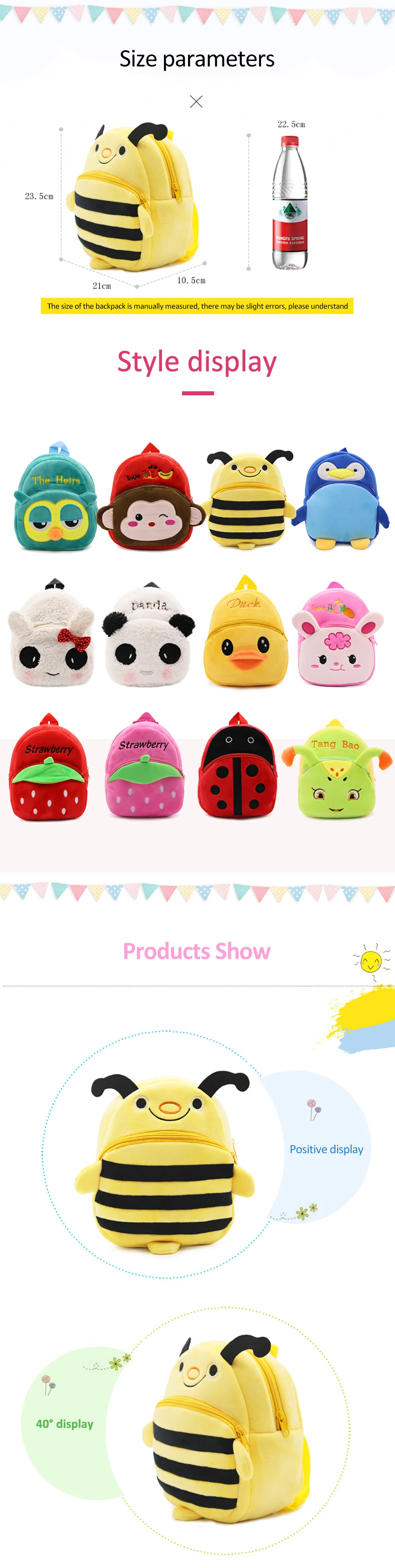 Рюкзак для детского садаМатериал: плюшМультяшные животные: пчела/Слон/Кролик/панда/пингвин...Цвет: как показаноРазмер: 21*10,5*23,5 смУпаковка: 1 плюшевый рюкзакОсобенность:1. Небольшой рюкзак подходит для детей в возрасте 1-3 лет. Мягкий материал может эффективно защитить плечи ребенка от травм.2. Мультяшные животные, любимые детьми, лучший школьный рюкзак для детского сада3. Сверхлегкий рюкзак, он очень удобен для детей в использовании, без ощущения веса4. Застежка-молния, регулируемый ремешокМы предоставляем профессиональный сервис прямых покупок. Мы гарантируем, что в посылка входят счета-фактуры, рекламные материалы, визитки. Кроме того, мы предоставляем полный сервис отслеживания груза, чтобы обеспечить безопасное прибытие груза.