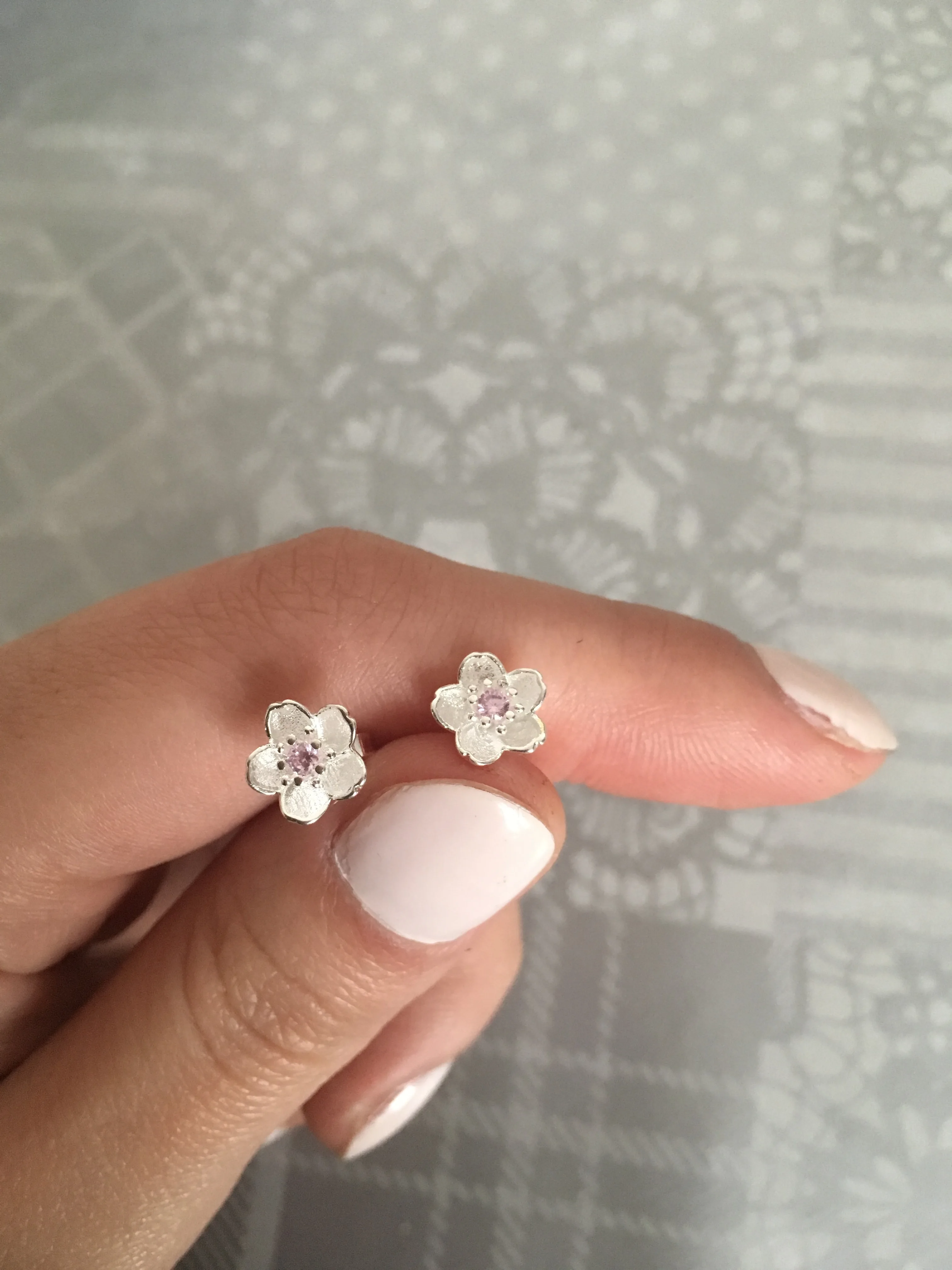 Серьги-гвоздики женские серебристые с цветком вишни и кристаллами