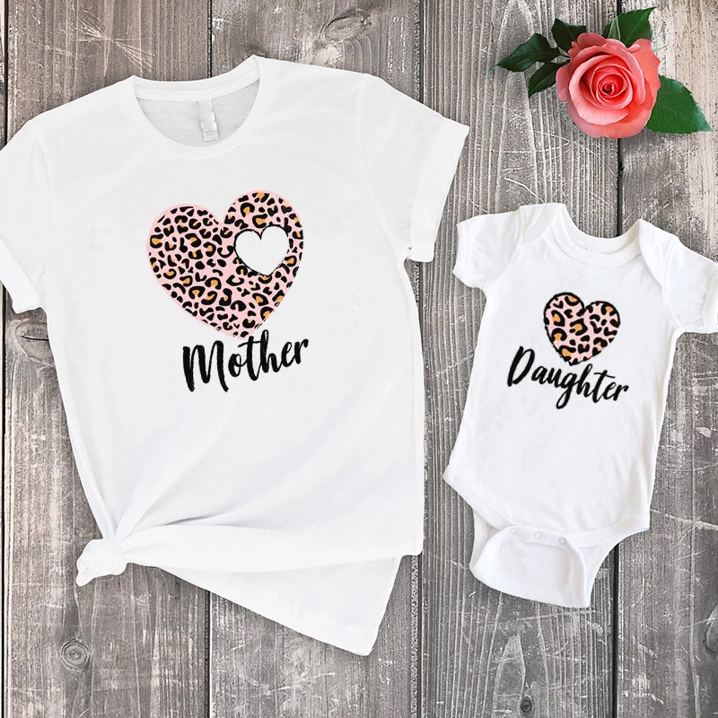 Рубашка для мамы и меня, футболка для мамы и дочки, одежда для маленьких девочек с леопардовым принтом, футболка с сердечками для девочек, одинаковая семейная