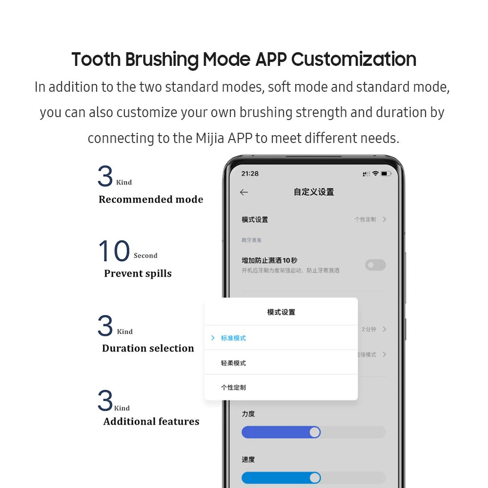 1. Описание:XIAOMI MIJIA T700 электрическая зубная щетка IPX7 Водонепроницаемая перезаряжаемая звуковая зубная щетка с таймером/3 + режимы/2 насадки для щеток умная отбеливающая зубная щетка работает с приложением Mijia Беспроводная гигиена полости рта для взрослых и детей2. Особенности:Крупный светодиодный смарт-экран, функция режима четкая с первого взгляда, и вы можете настроить персонализированные прозвища и самовыражения.Высококачественная супер мягкая щетина и 4 мм супертонкая головка щетки очень подходят для чувствительной полости рта, мягкой, деликатной и не раздражающей.Звуковой двигатель с магнитной левитацией обеспечивает супер чистую мощность и плавное управление питанием для точного контроля силы чистки.Работает с приложением MIJIA-вы также можете настроить свои собственные силы и продолжительность чистки, подключив приложение Mijia для удовлетворения различных потребностей.Когда сила чистки слишком сильна, напоминание о избыточном давлении активируется, чтобы предотвратить кровотечение десен из-за чрезмерной силы.Характеристики: Водонепроницаемый IPX7, емкость аккумулятора 1050 мАч и поддержка беспроводной зарядки.3. Инструкции:Включение питания:Короткое нажатие кнопки питания, режим по умолчанию является стандартным режимом для первого включения питания.Режим переключения:В течение 10 секунд после запуска, короткое нажатие для переключения режима.Пауза:Длительное нажатие в течение 2 секунд для паузы и автоматическое выключение после 30 с паузы.Выключение питания:10 секунд после включения, короткое нажатие для выключения питания; В течение 10 секунд после включения питания, непрерывное короткое нажатие для переключения режима до выключения питания.Совет:Этот продукт запомнит последний режим, который остался более 10 секунд. Выключите после пребывания в определенном режиме более 10 секунд, режим которого является режимом по умолчанию, так как в следующий раз вы включите устройство.Введение режима чистки:Рисунок R:Стандартный режим-подходит для ежедневной чистки полости рта.S узор:Деликатный режим-подходит для людей с чувствительными зубами.Рисунок сердца:Индивидуальный режим настройки-по умолчанию 2 минуты супер режим. Больше функций и режимов можно установить в приложении MIJIA: время чистки, предотвращение разбрызгивания на 10 с, новый режим и многое другое.4. Характеристики:Наименование товара: электрическая зубная щетка XIAOMI MIJIA T700Режим: MES604Цвет: синийРазмер изделия: 27 (диаметр) * 255 ммВес нетто: прибл. 220 гМатериал головки кисти:Зарядка: Беспроводная зарядка, время зарядки 6 чНоминальное входное напряжение: 5 В пост, 1AНоминальная мощность: 4,2 WВодонепроницаемость: IPX75. Примечание:Возможна небольшая разница в измерениях вручную.Фактическое использование может немного отличаться в зависимости от конкретной ситуации.Цвет товара на фотографиях может слегка отличаться на разных мониторах компьютера так как мониторы откалиброваны по-разному.Гарантия на продукт только для клиентов в Китае,Иностранные клиенты не могут быть гарантированы, пожалуйста, поймите.6. Посылка:1 * хост2 * крышка головки кисти1 * крышка вала питания2 * головка щетки1 * Зарядная база1 * Руководство (CN)