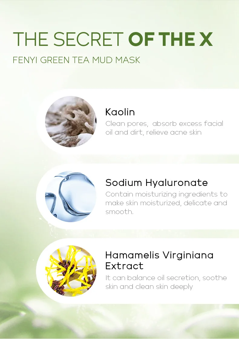 Смешанный экстракт зеленого чая с минеральной грязью, маска зеленого чая FENYI может поглощать избыточное масло и грязь на лице, мягко очищать кожу. Содержит цветок хамамелиса виргиниана воды и гиалуронат натрия, он может облегчить и восстановить кожу, делая кожу чистой, мягкой и гладкой.