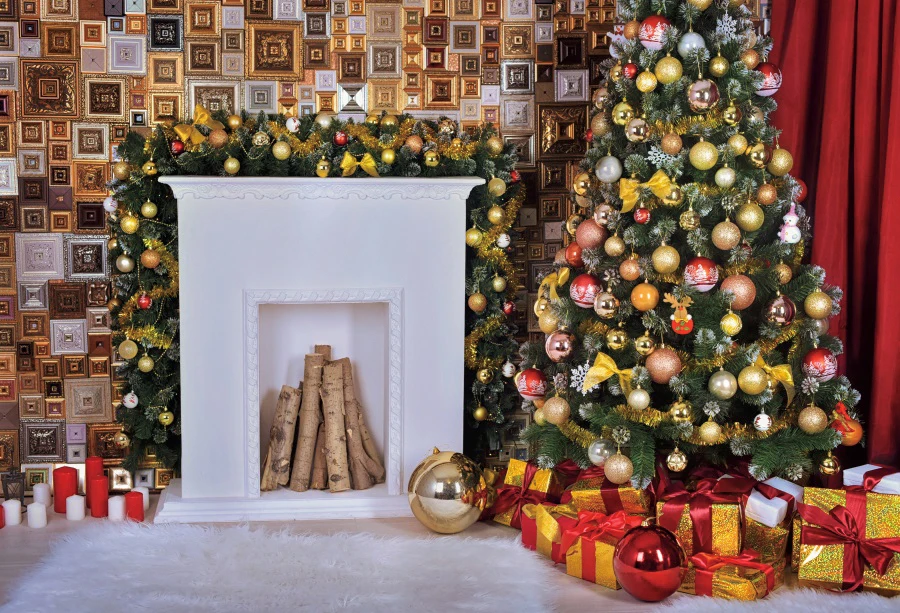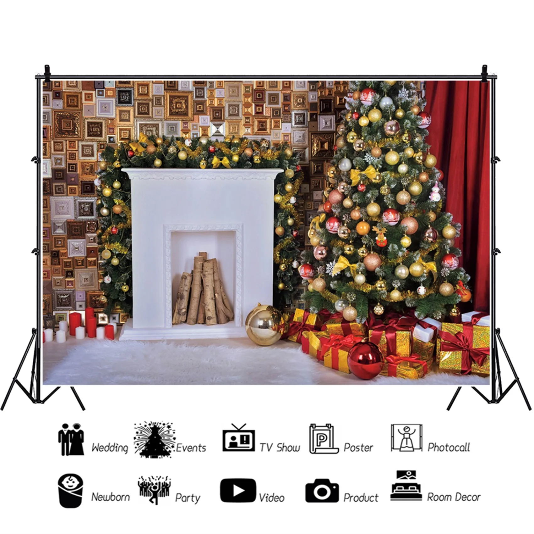 Фон для детской фотосъемки Laeacco с изображением рождественской елки камина подарков цветных шаров свечей интерьера фотостудии