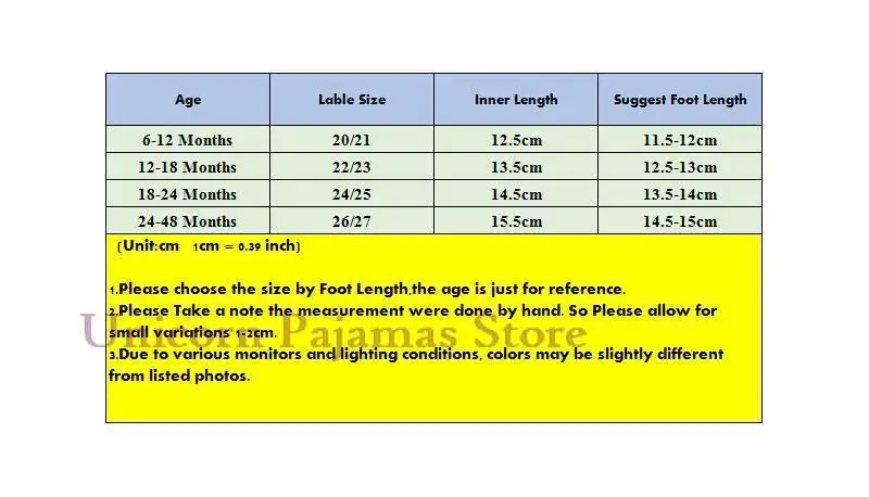 (Единица измерения: см, 1 см = 0,39 дюйма)1. Пожалуйста, выберите размер по длине стопы, возраст указан только для справки.2. Пожалуйста, обратите внимание, что измерения были сделаны вручную. Поэтому возможны незначительные погрешности в 1-2 см.3. Из-за различных мониторов и условий освещения цвета могут немного отличаться от приведенных фотографий.