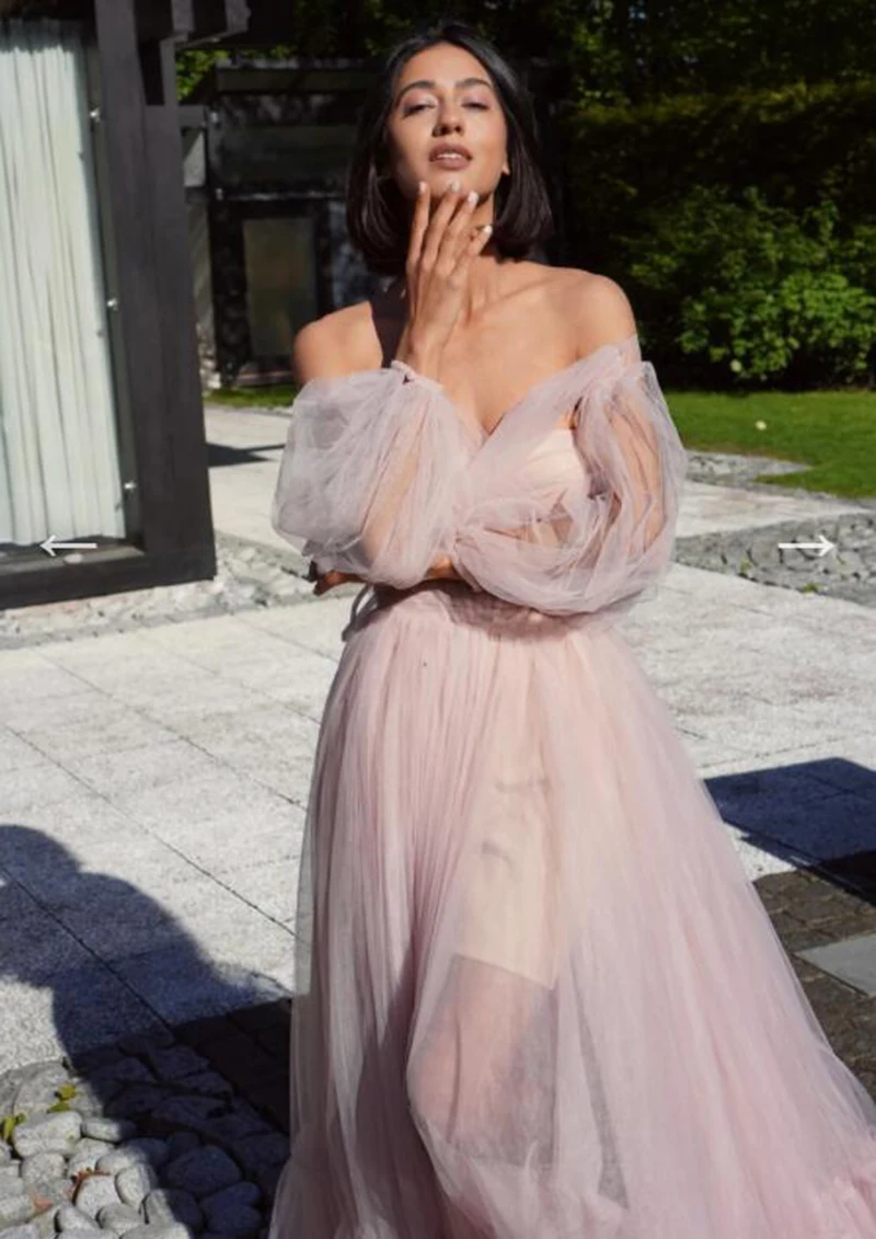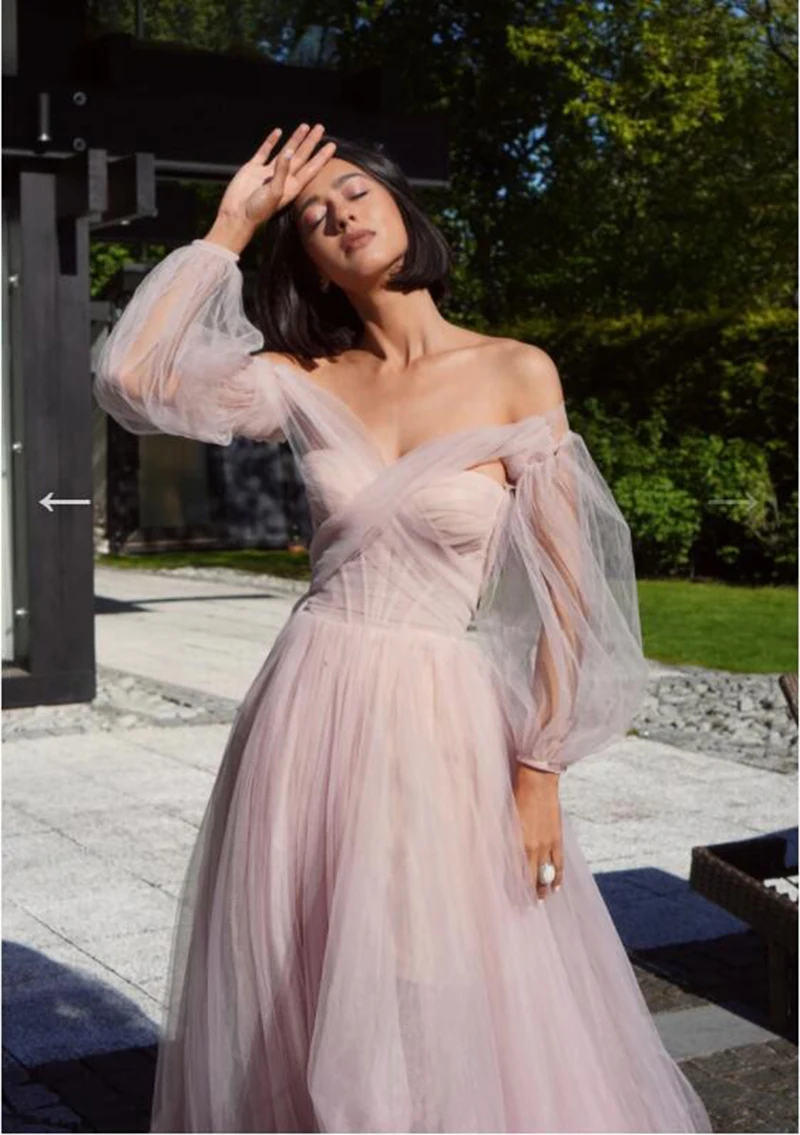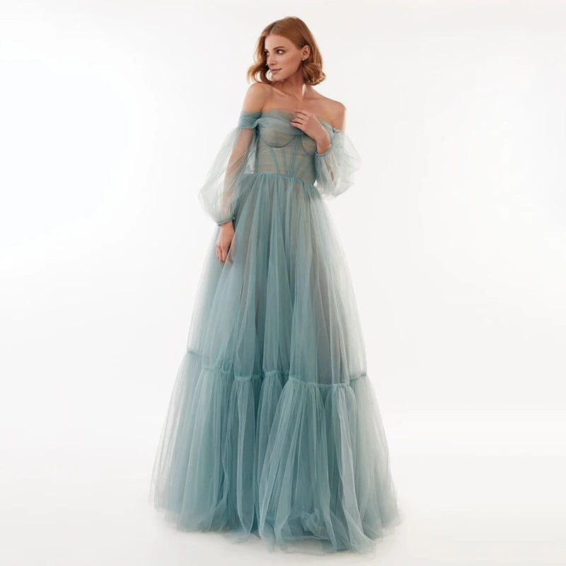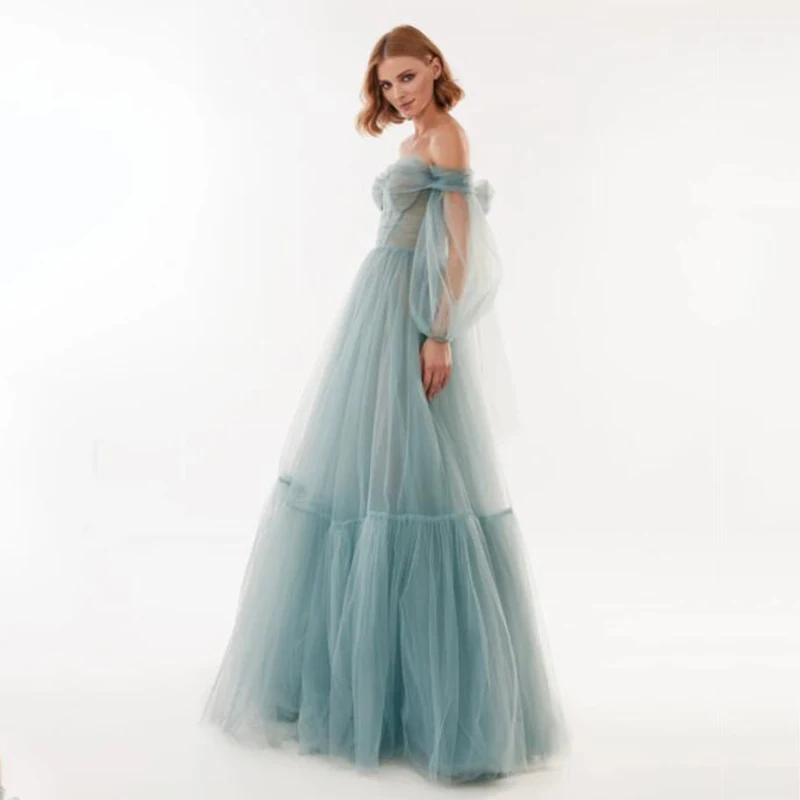Женское длинное вечернее платье с открытыми плечами и буффами на рукавах