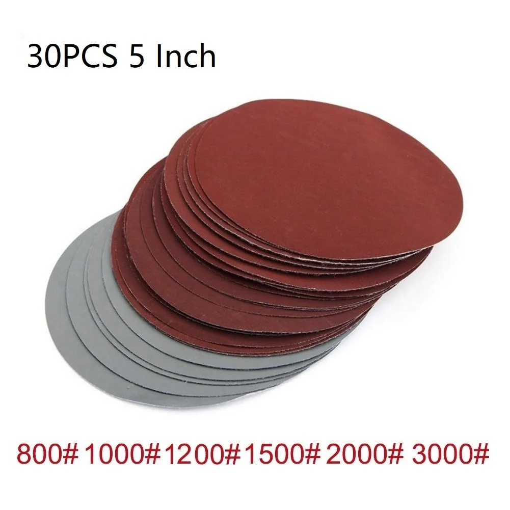Круглые шлифовальные диски с крючком и петлей, 30 шт., 5 дюймов, 125 мм, зернистость 800, 1000, 1200, 1500, 2000, 3000, полировальные диски