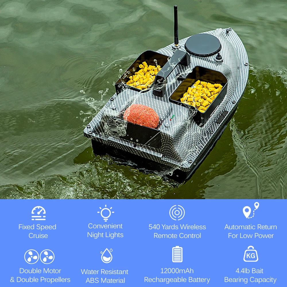 Особенности:Функция GPS помогает установить 4 произвольных точки позиционирования, и лодка может быть вперед и назад на основе точки, которую вы устанавливаете.При обнаружении потери сигнала или низкого заряда батареи лодка автоматически вернется в исходное положение через 15 секунд. Не беспокойтесь о потере.ЖК-дисплей пульта будет отображать несколько данных для вашего, таких как питание батареи, расстояние, компас, положение и светильник.3 контейнера для наживки с около 4.4lb несущей способностью для большего количества наживок.Беспроводное управление и Круизный переключатель с фиксированной скоростью позволяют выпустить приманку далеко. (Дистанционный диапазон: 500 метров/540 ярдов)Двойные двигатели и двойные пропеллеры делают лодку легкой в спорте и кролировании.1 передние белые огни и 2 задние синие ночные огни для ночной рыбалки и кормления.Лодка-приманка питается от аккумуляторной батареи (в комплекте). Съемный аккумулятор позволяет легко заряжать отдельно без лодки.Обтекаемый корпус уменьшает Водонепроницаемость и 6-7 уровней устойчивость к волнам.Пульт дистанционного управления питается от 4 батареек AA (в комплекте).Спецификация:Функция: без GPS/с GPS (опционально)Аккумулятор лодки-приманки: 5200 мАч/12000 мАч (опционально)Время работы: прибл. 3 ч/5 чВремя заказа: ≥ 10 часов/≥ 14 часовМатериал: АБС-пластикНесущая способность: кг/2 кг/4,4 фунтов лёгкий нейлоновый тросДистанционный диапазон: 500 м/540 ярдовПульт дистанционного управления: 4 батарейки типа АА (в комплекте)Размер лодки: 50*25*17 см/19,7*9,8*6,7 дюймовВес: прибл. 1,7 кг/3,7 фунтовРазмер посылка: 56*32*25 см/22,0*12,6*9,8 дюймовВес посылка: прибл. 2,58-2,82 кг/5,7-6,2 фунтов лёгкий нейлоновый тросПосылка:1 * Лодка-приманка1 * батарея лодки приманки1 * пульт дистанционного управления4 * батарейки AA (для дистанционного управления)1 * антенна1 * Руководство пользователя1 * зарядное устройство2 * Запасные пропеллерыПримечание:1. Цвет товара, отображаемый на фотографиях, может немного отличаться на мониторе вашего компьютера, так как мониторы. Спасибо за понимание.2. Контейнер для наживки влево и вправо без функции самостоятельного возврата, вы должны вытянуть его назад руками после освобождения. Но задний контейнер для наживки возвращается обратно с помощью пульта дистанционного управления.3. Больше работы с пультом дистанционного управления, пожалуйста, обратитесь к руководству пользователя.