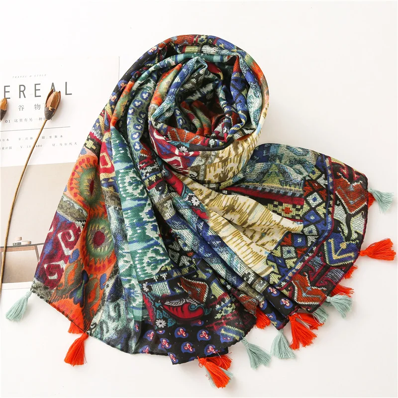 Женская зимняя шаль из вискозы, с цветочным принтом и кисточками
