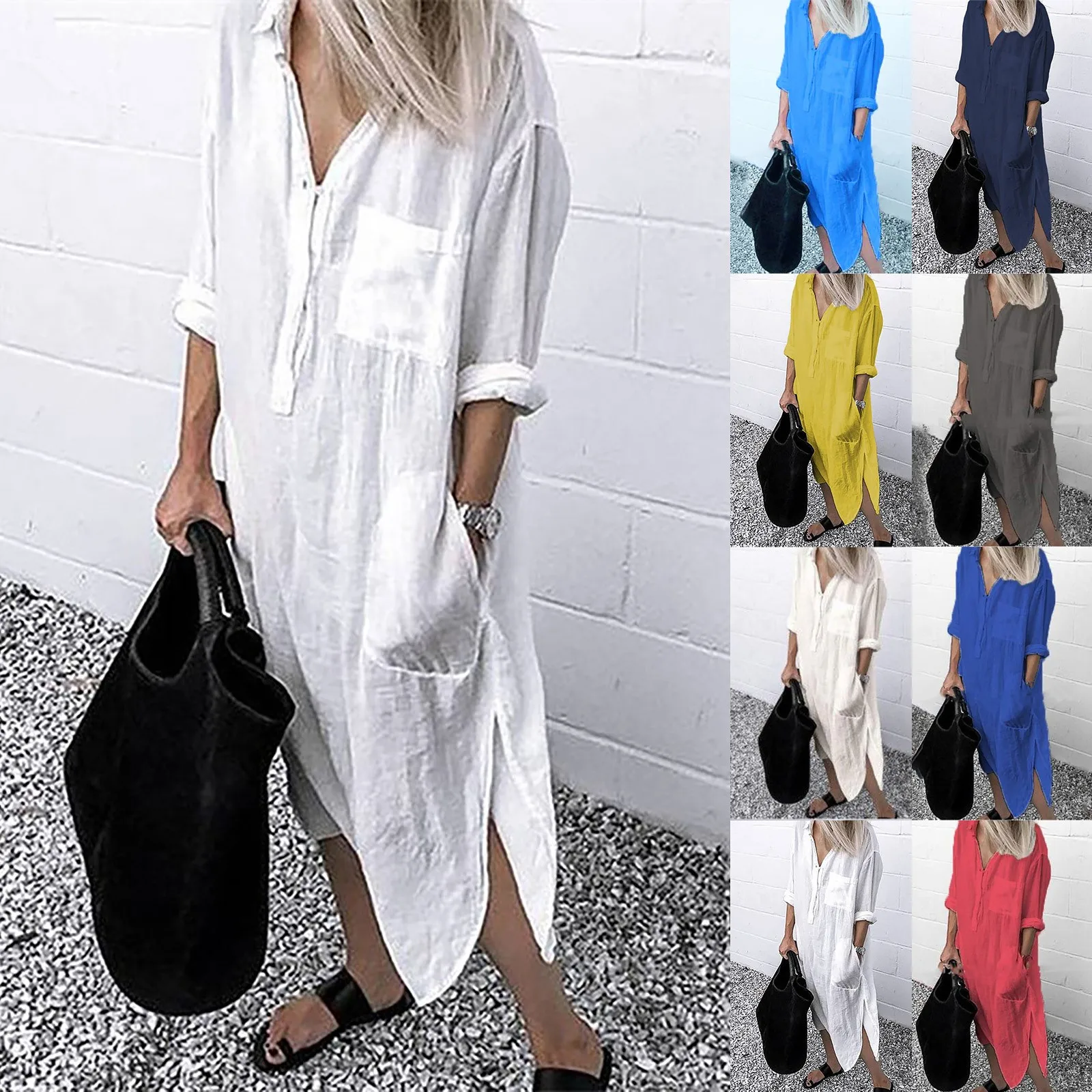 Женское Элегантное Длинное Платье-рубашка из хлопка и льна, модное ...