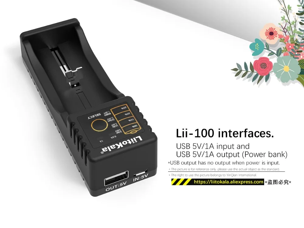 Lii-100 характеристики:• Входная мощность 5 В/1 а постоянного тока.• 1 Независимый порт• Светодиодный режим показывает различные режимы• 2 тока зарядки (500, 1000 мАч)• Поддерживает различные размеры батареи• Автоматическое определение типа аккумулятора (литий-ионный аккумулятор 3,7/3,8 V никель-металл-гидридных или никель 1,2 V и Li-Fe 3,2 V)• Защита от перезарядки. Положительная и отрицательная защита обратного соединения. Защита от перегрева. NiMH батарея обнаружения отрицательного напряжения (-dtv).• Обнаружение неисправности аккумулятора• Usb-выход 5 в 1000 мАч• Для NiMH / CD AAA / Micro, AA / mignon, c.Li-Ion 26650, 22650, 18650,18490, 18500,17500, 17355, 16340 (RCR123), 14500, 10440