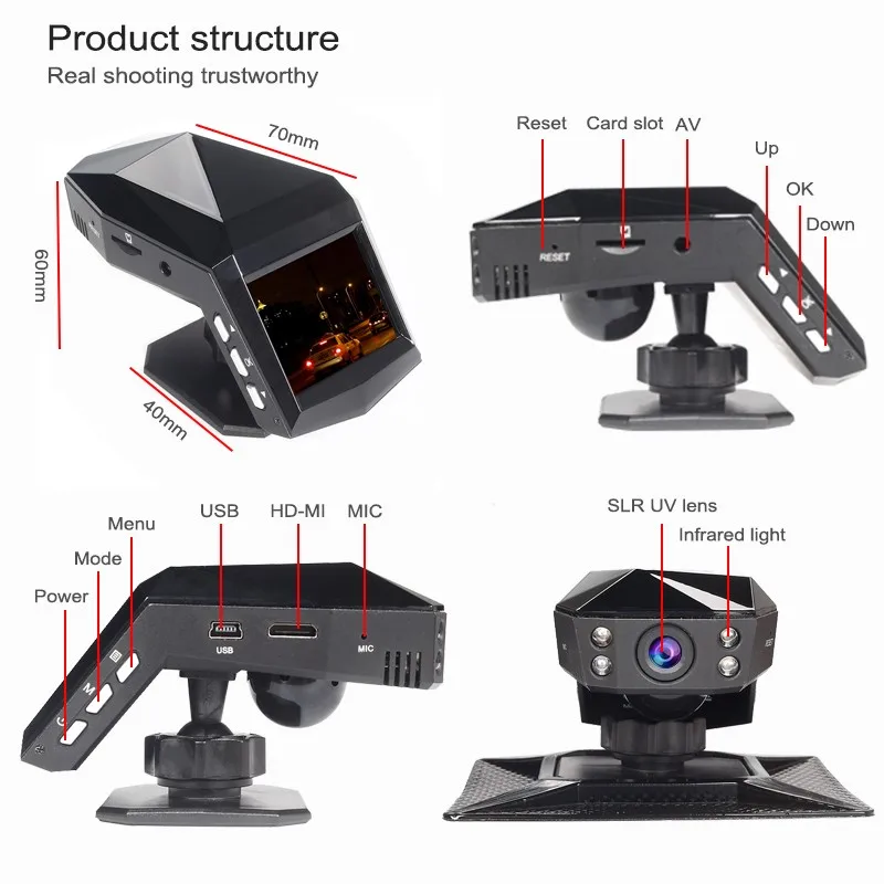 ОсобенностиРазрешение видео: 1080PРазмер экрана: 2,0 дюйм (ов)Формат видео: AVIФормат фото: JPEGУгол Линзы: 170 °Функция: циклическая запись, мониторинг парковки, обнаружение движения, датчик гравитацииTF: 8G ~ 32GB (C10)Рабочее напряжение: 5 В постоянного токаРабочий ток: 1500маЧастота: 50 Гц/60 ГцТемпература хранения: -20 ℃-70 ℃Рабочая температура: 0 ℃-60 ℃Аккумулятор: 200 мА ВстроенныйПосылка включает в себя1 х Автомобильный видеорегистраторАвтомобильное зарядное устройство-1 шт.1 х Руководство1 нескользящий коврик