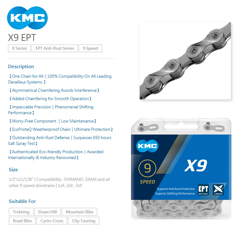 Бренд: KMCСкорость: 8/9/10/11 СкоростьМодель: X8EPT/ X9EPT/ X10EPT/ X11EPT/Ссылки: 116L