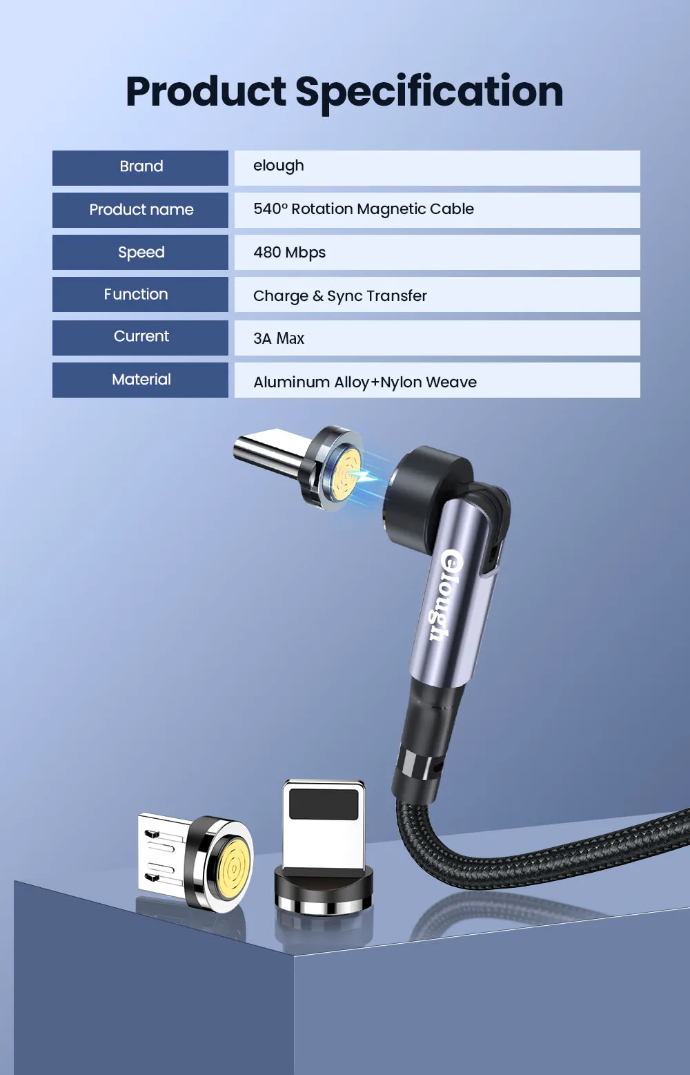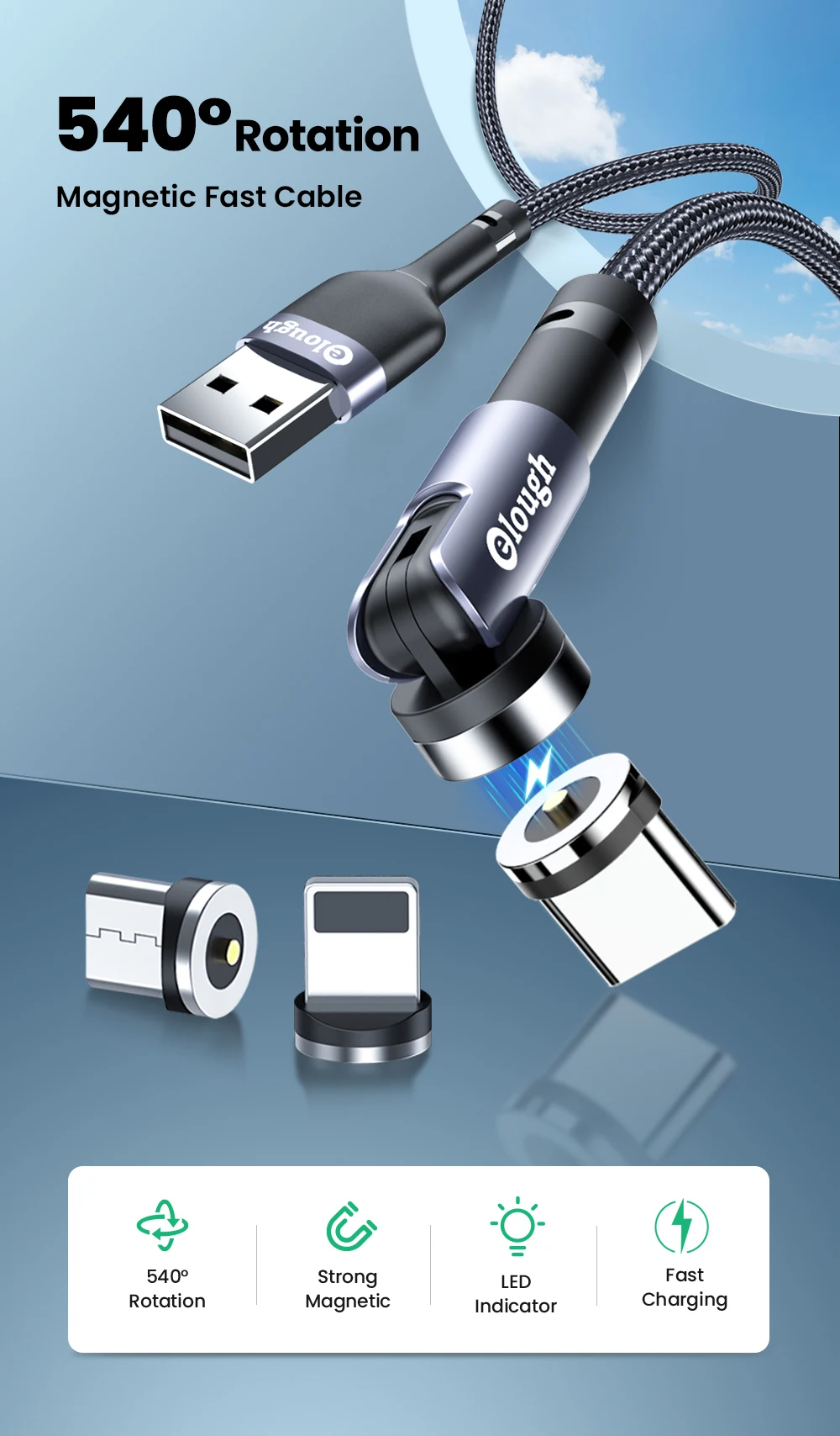 Магнитный зарядный кабель Elough, вращающийся на 540 градусов, 3 А,...