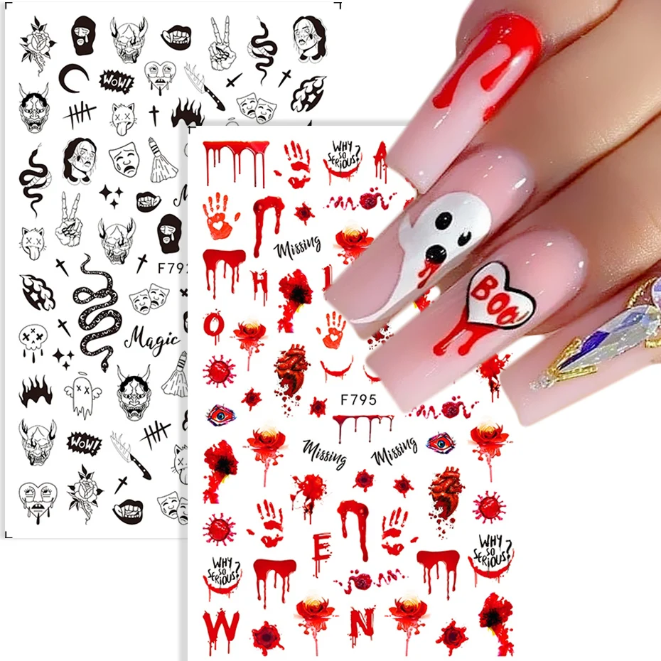 Наклейки для ногтей с кровавой раной на Хэллоуин, змеи, красные шрамовые губы, татуировки, снежинка, Рождество, аниме, дизайн ногтей, слайдеры, SAF795